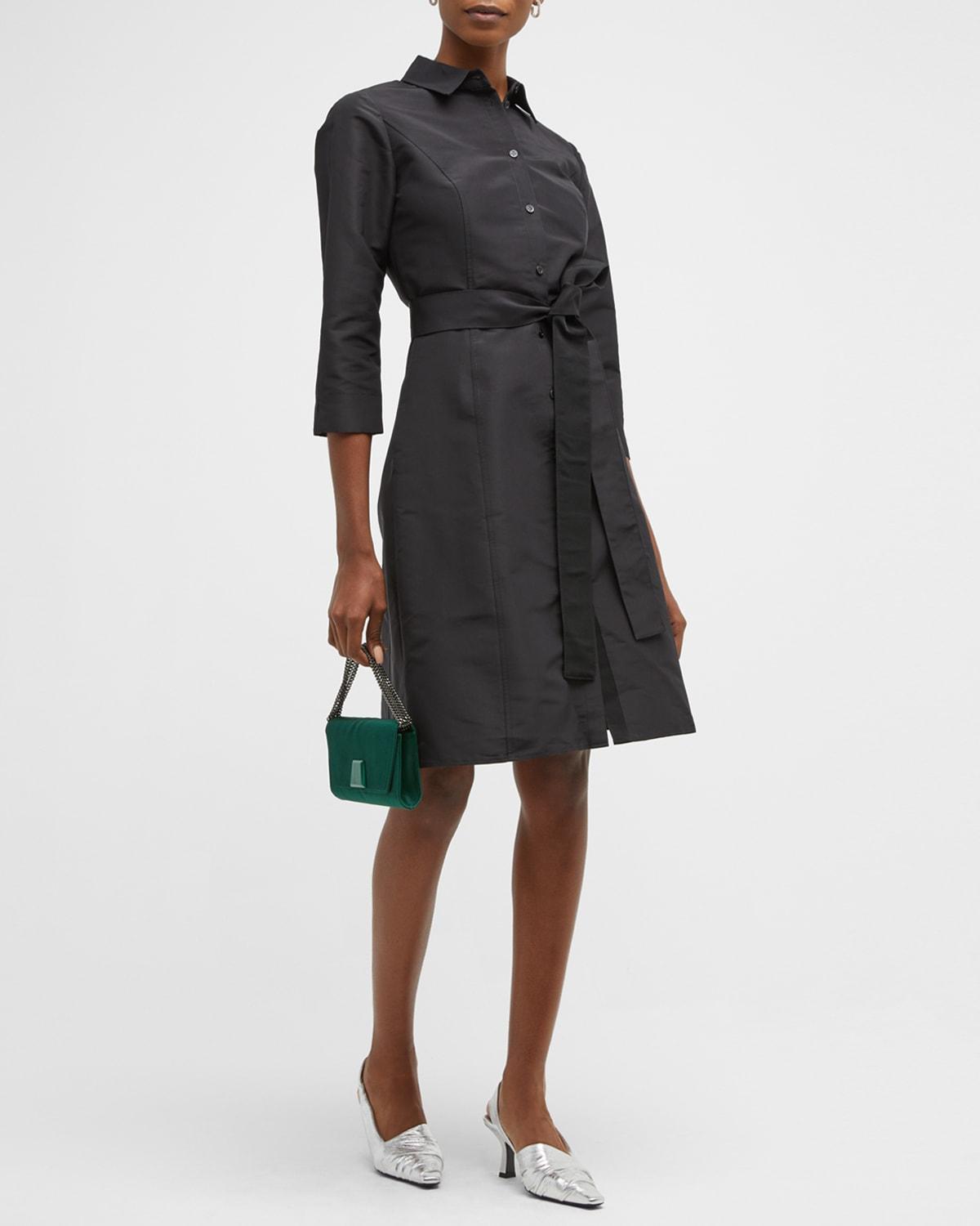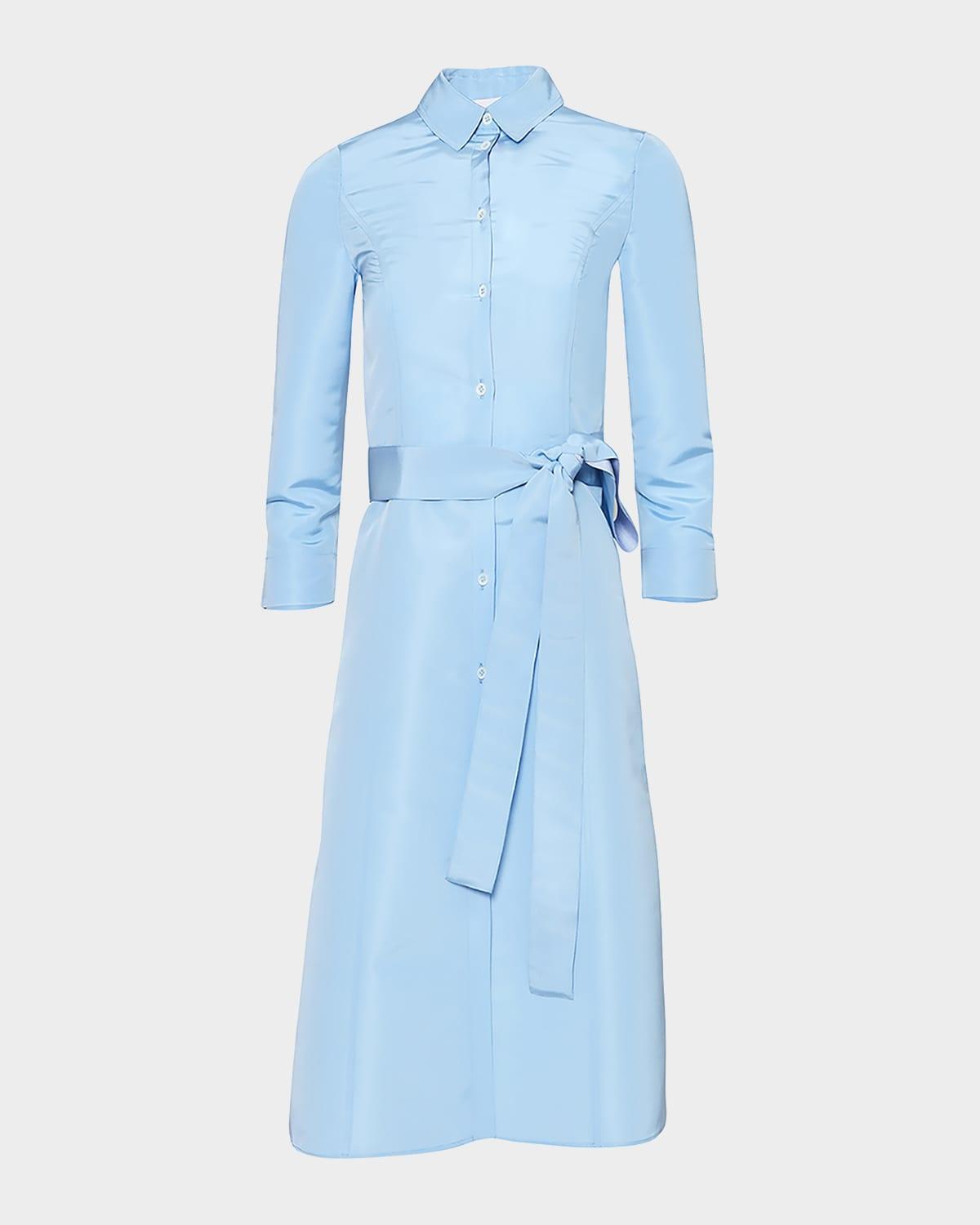 Carolina Herrera shirtdress in silk faille. Approx. length: 43" from shoulder to hem. Collar. Three-quarter sleeves. A-line silhouette. Hem hits about at the knee. Silk. Dry clean. Made in Portugal.