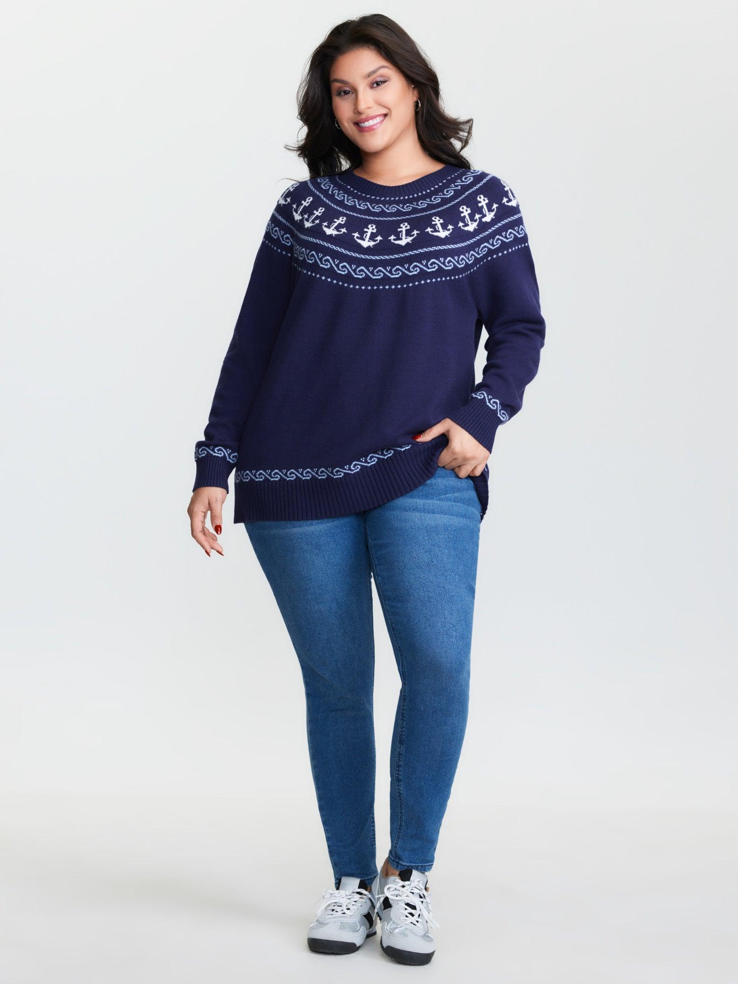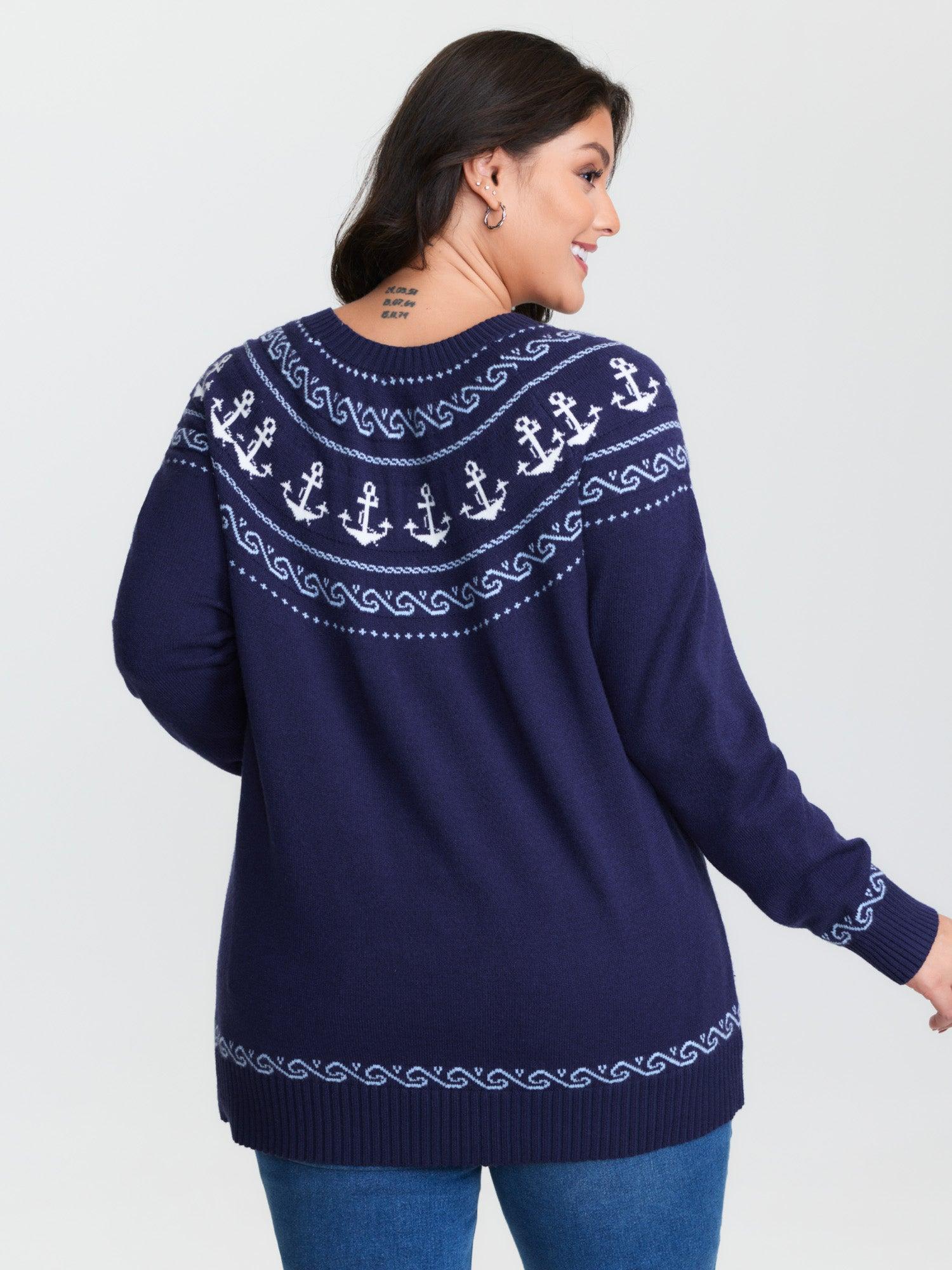 Shop Fair-Isle Nautical Elements Jacquard Pullover now and redefine your style with confidence at BloomChic. Tailored for mid and plus-size women. This trendy Sweaters Cardigans Women, sizes 10-30. Color:Indigo;Style:Leisure;Neckline:Round Neck;Sleeve Type:Raglan sleeve;Prints:Non;Pocket:No-pocket;Belt:No-belt;Closure Type:Non