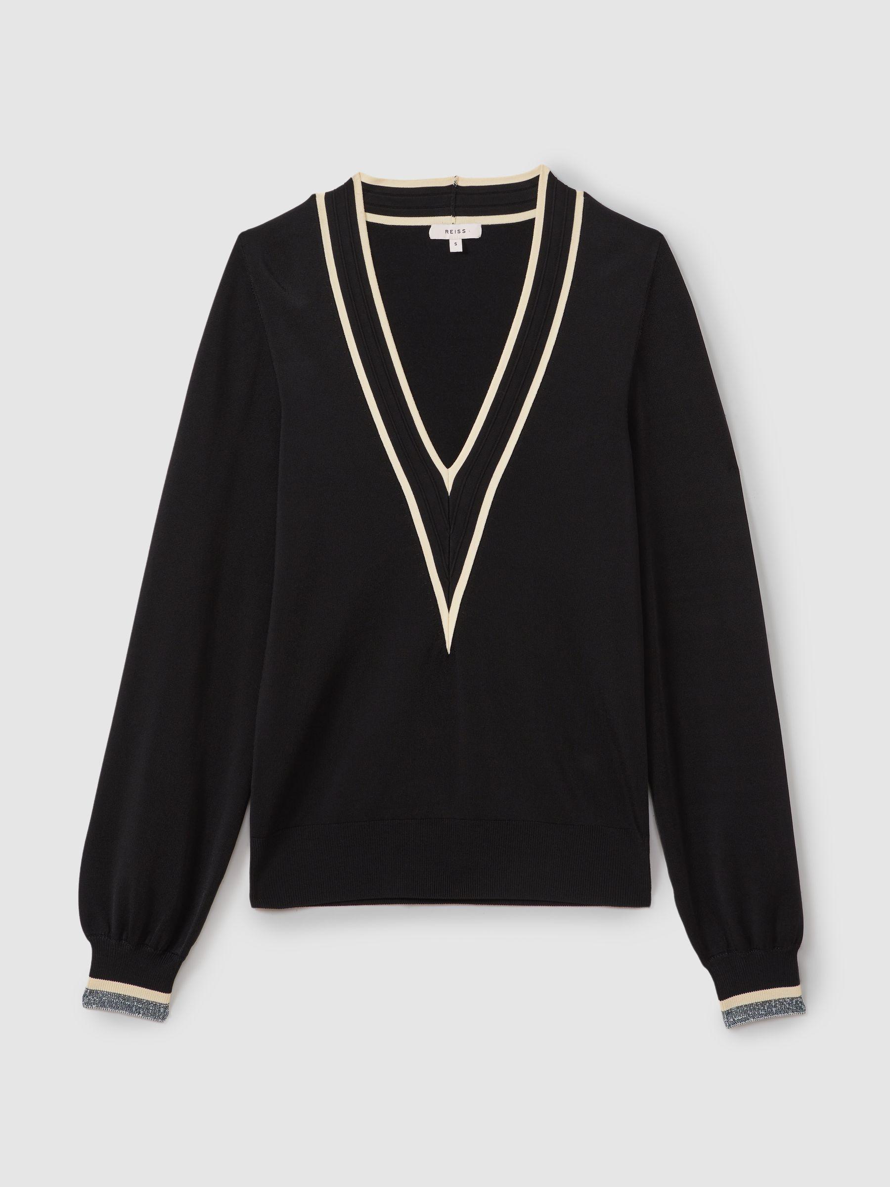 The Faith jumper is made from a slinky jersey fabric that’s elasticated through the waist and cuffs for a blouson shape. The sides and V-neckline are enhanced with contrast details. V-neckline Contrast details The model is wearing a size S Measurements of model: Height 5ft 10" / 178cm