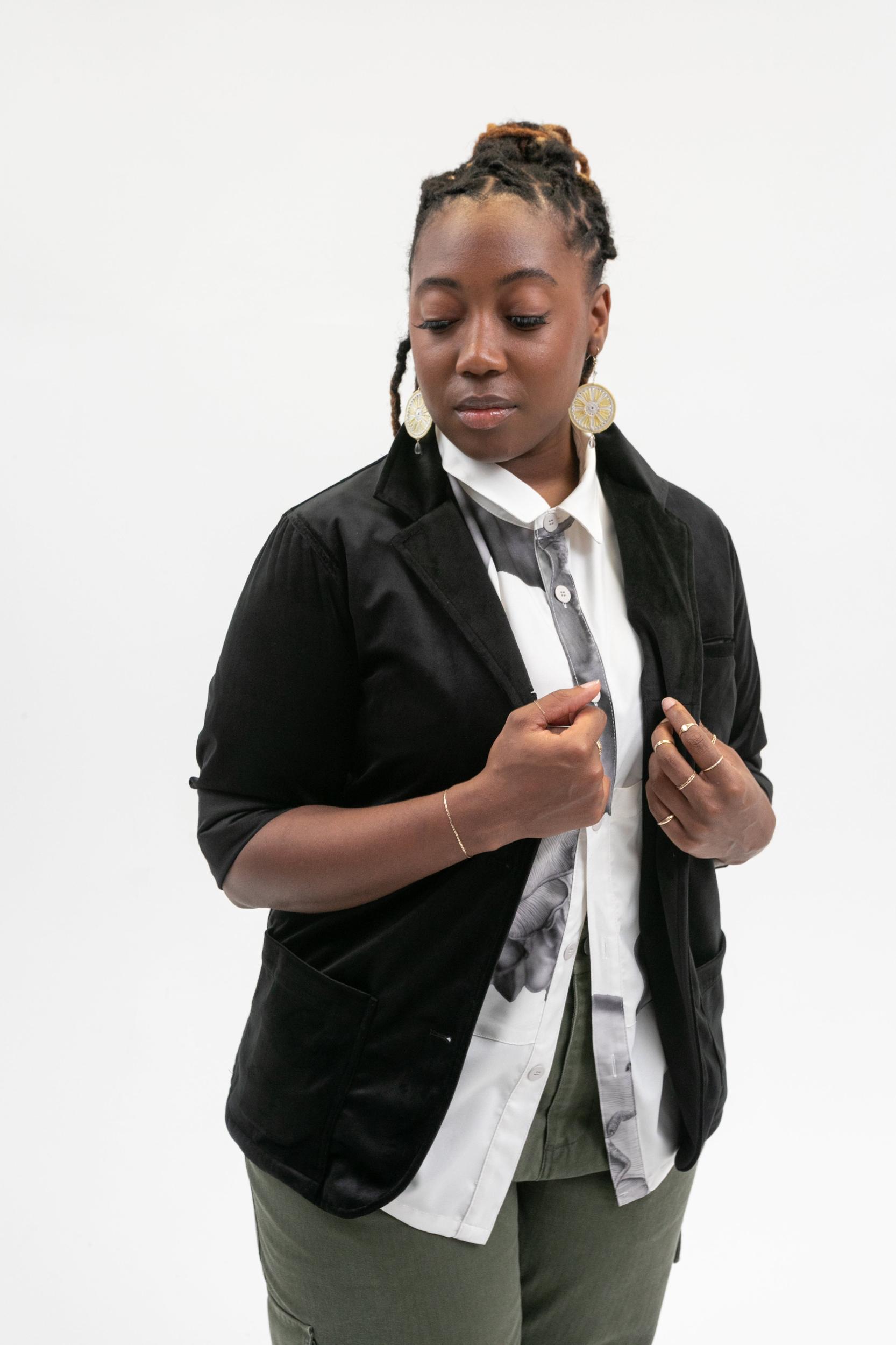 Discover the perfect balance of comfort, elegance, and utility with the Fall Formal Women's Work Blazer. Thoughtfully designed for hospitality professionals, this blazer tailored fit, designed for the kitchen to a night out, this blazer embodies refined versatility for every occasion. Offered in three fabric options, Black Herringbone Cotton, Black Twill and Black Velvet. Features: Pockets: Welt chest pocket, two hip patch pockets, and a hidden wine key pocket Fit: Adjustable button tabs and back vent slits for a customizable fit Functional Detail: Rear neck apron tab for easy access to essentials Formal yet functional, it’s your go-to for making an impression without compromising on practicality.