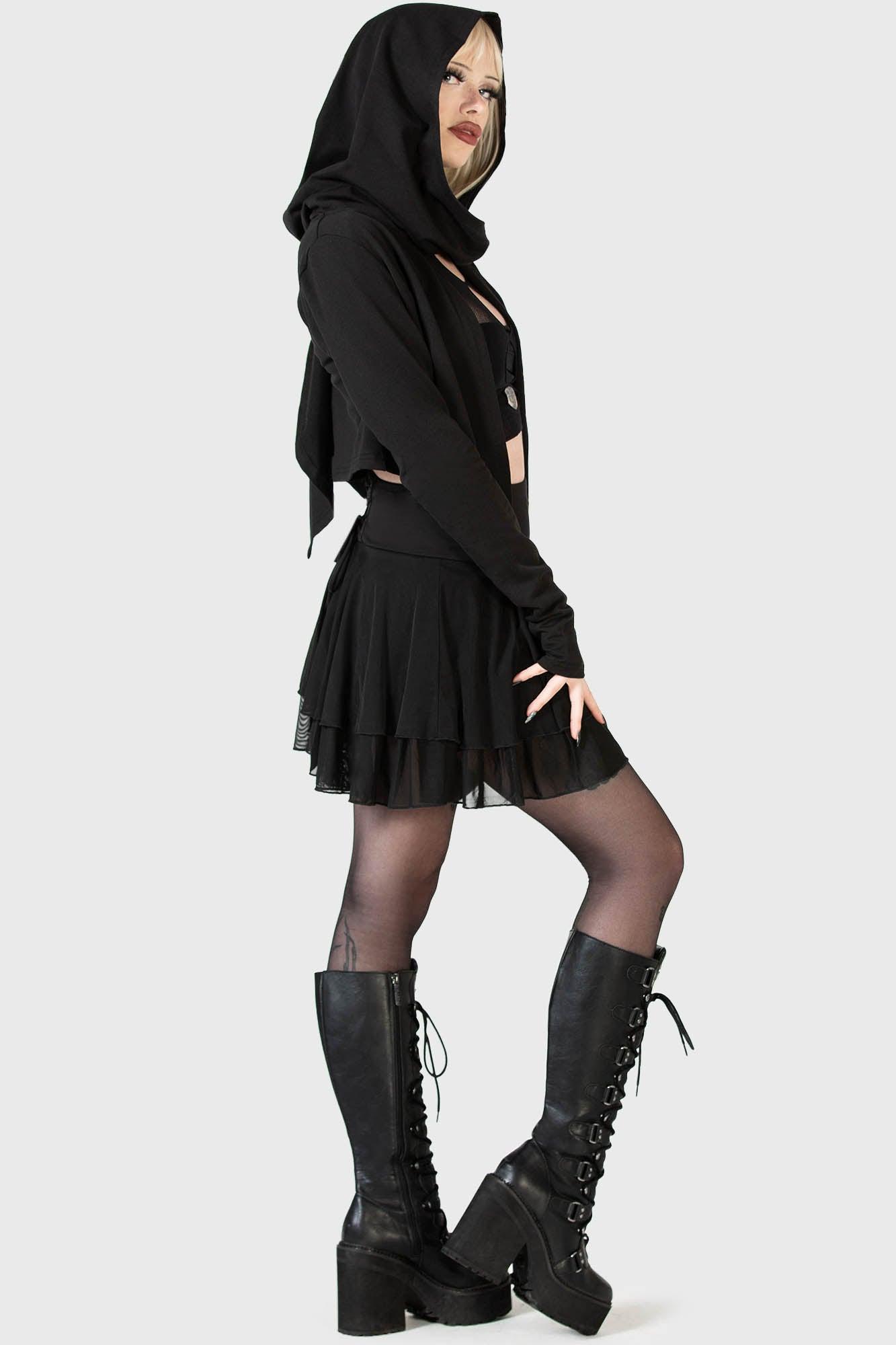 FALLEN LILITH.- Soft stretch cotton fabric.- Long sleeves with thumbholes.- Wrap around style.- Hi-low asymmetric hem.- XL Hood.- Fitted.With KILLSTAR branding, 100% Cotton. Machine wash cold (30°c) / Do not bleach / Do not tumble dry / Iron at low temperature / Do not dry clean. Imported.