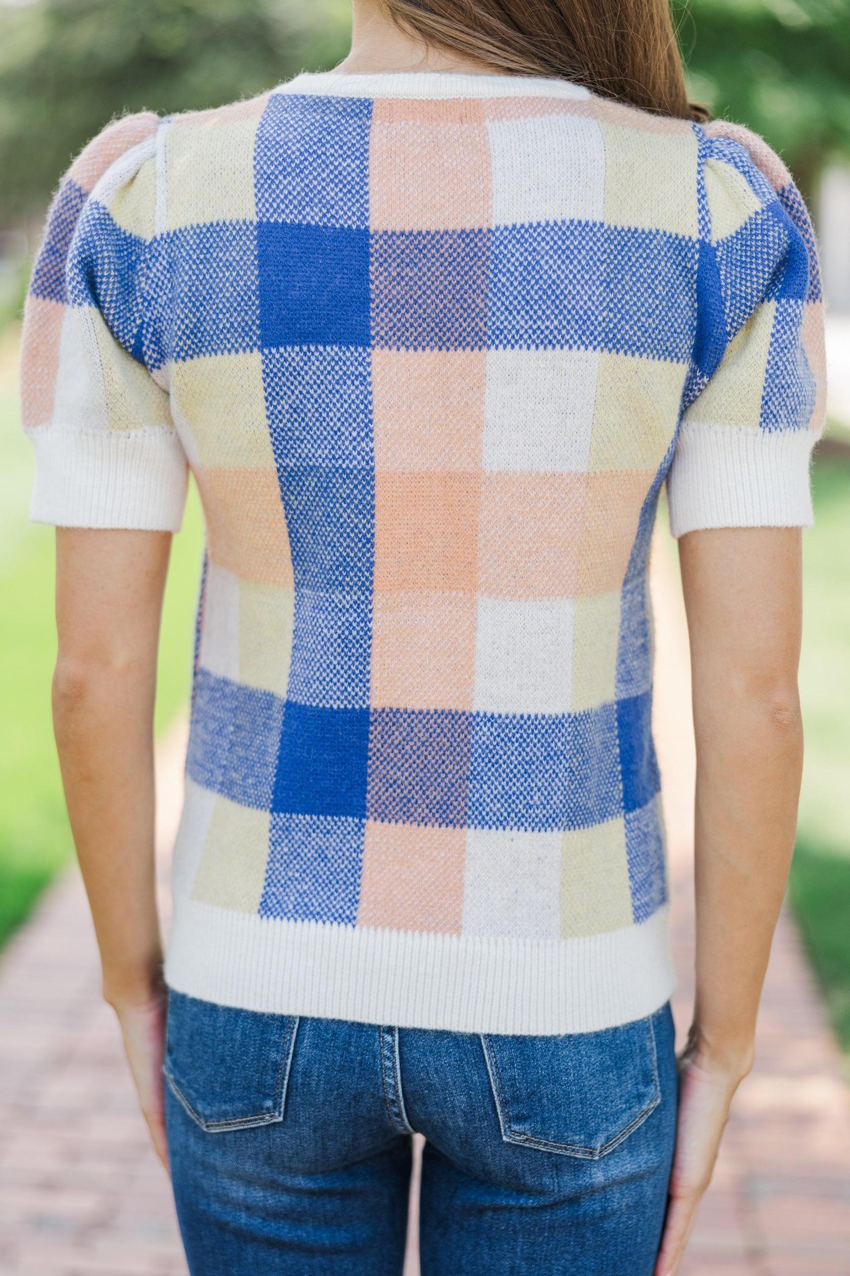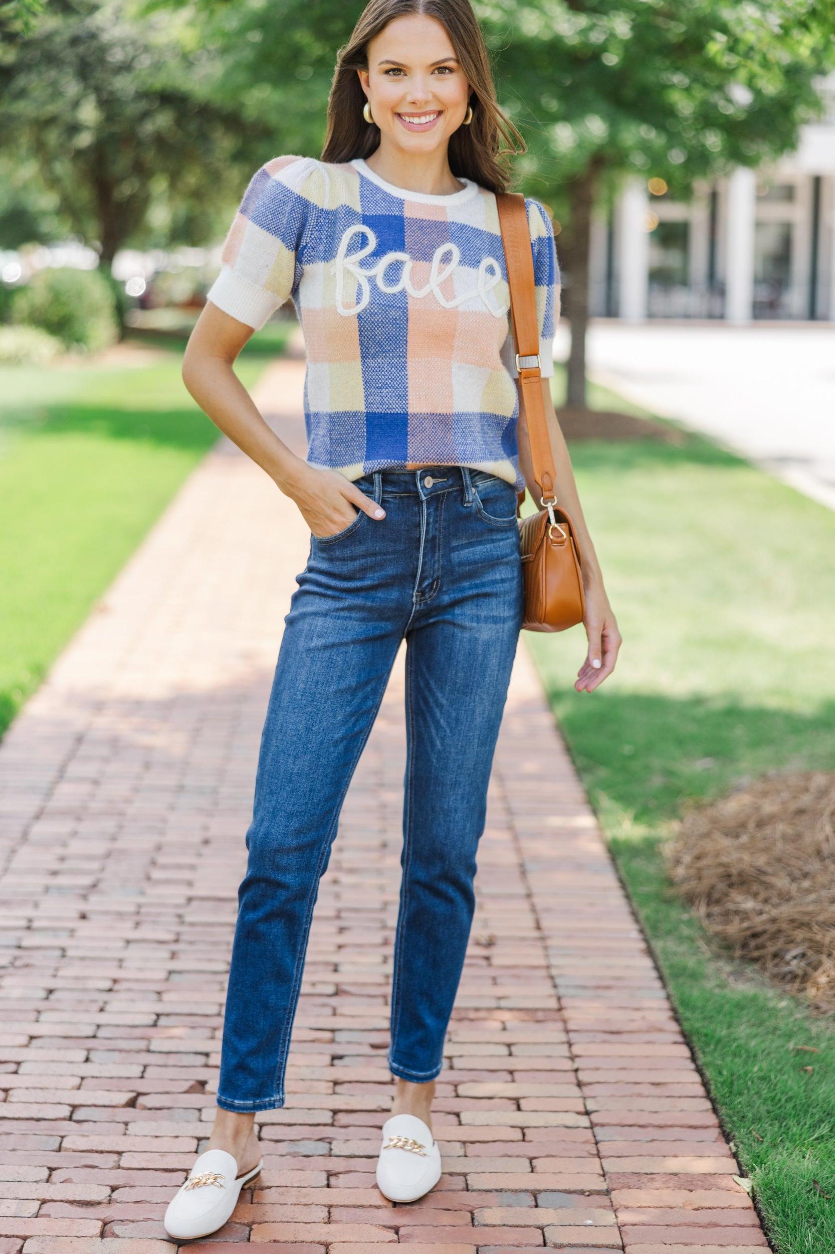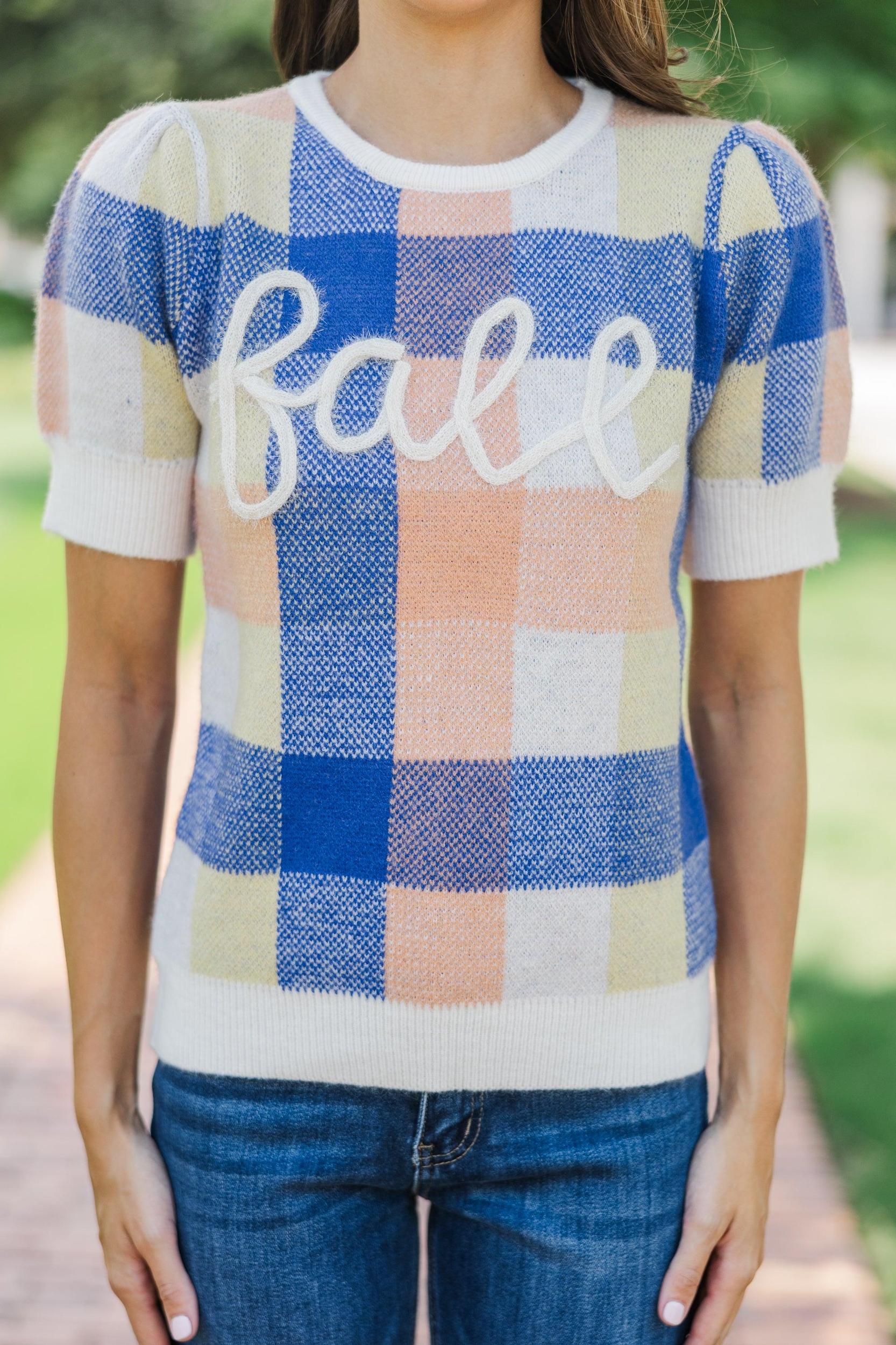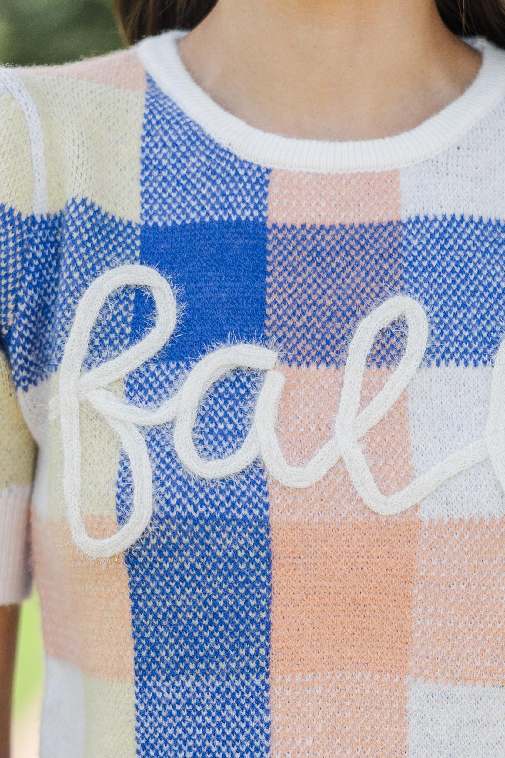 Are you falling for this sweater? Us too! How cute is that print and those colors are precious together! The script just makes this sweater even more perfect for the season! Round neckline Short puff sleeves Plaid print Script Generous stretch Sydney is wearing the small.