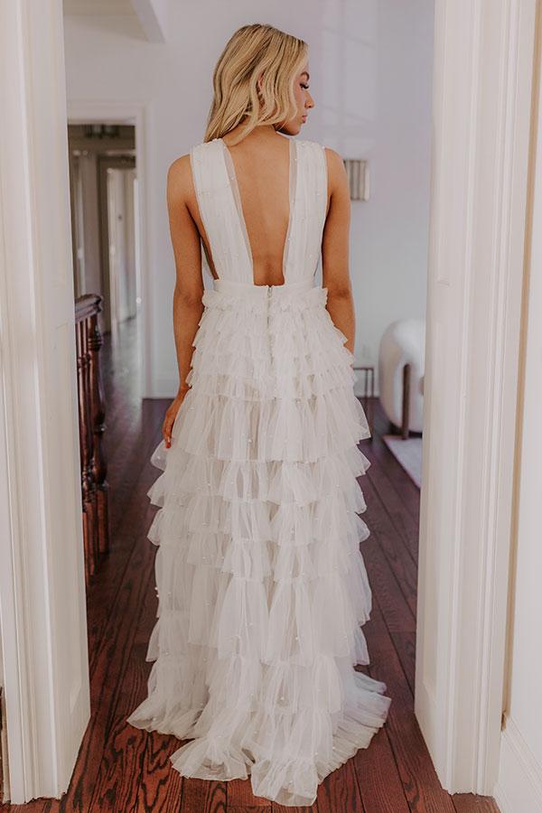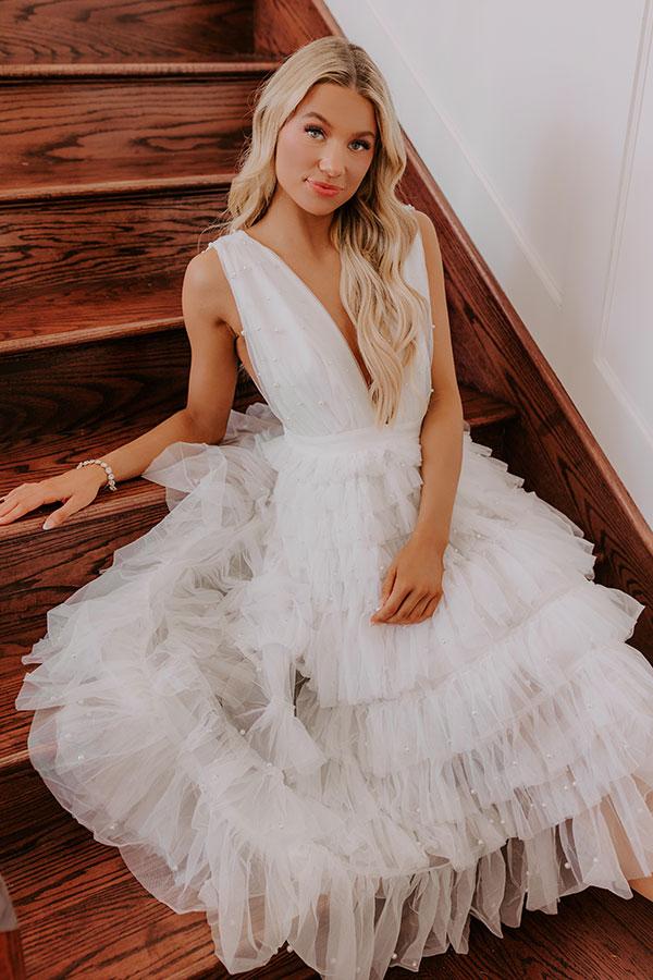 - Be ready to mesmerize with this stunning maxi dress! Gorgeous flowy tiers and pearl embellishment give this piece a whimsical vibe, perfect for embracing a romantic moment.