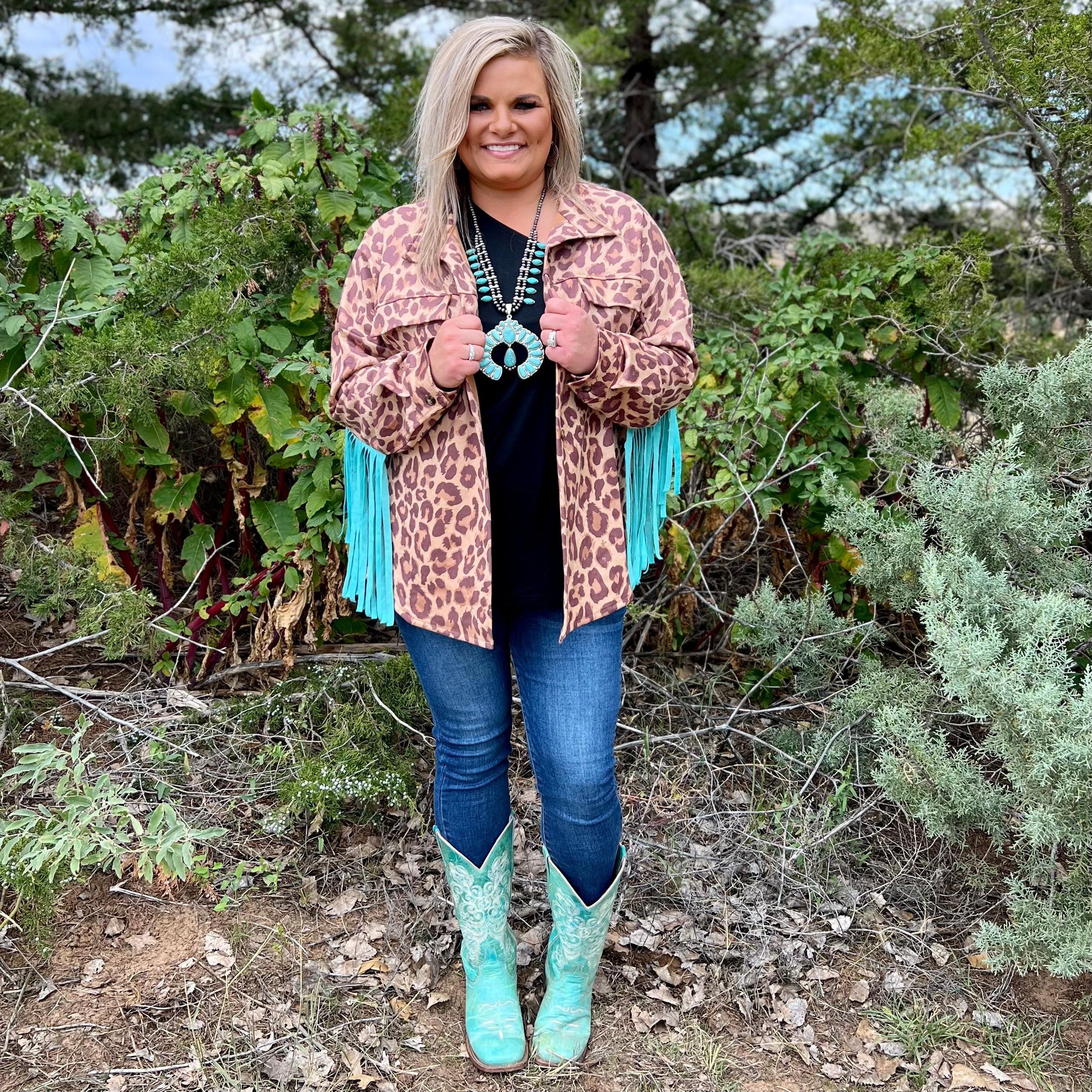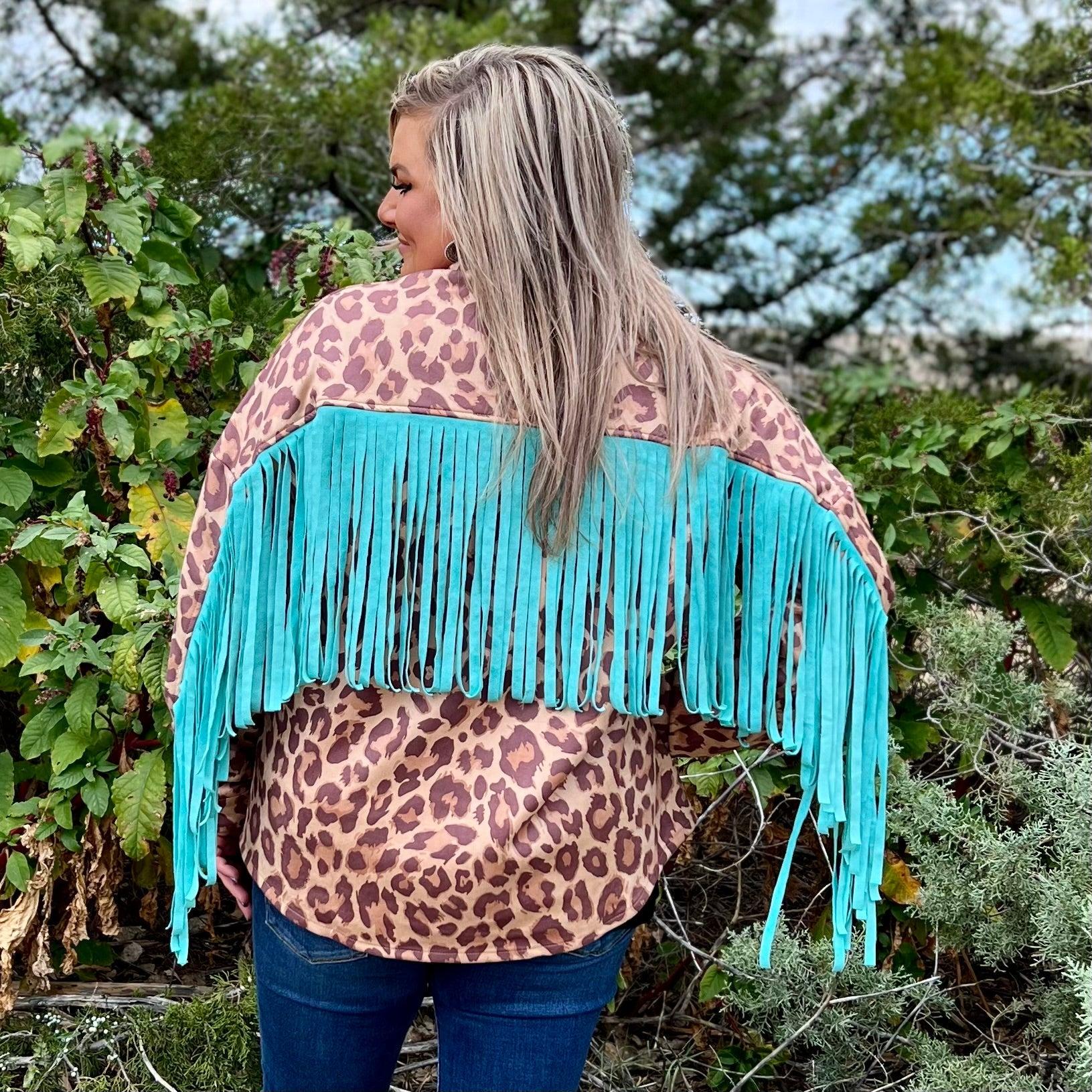 This leopard print jacket with turquoise fringe is a showstopper!!! The material this jacket is made of is super soft and has the most comfortable fit. Double pockets on the front, button up, and the fringe detail on the back and down the back of the sleeves completes the Vintage Look. 90% Polyester, 10% Spandex XS,S,M,L,XL