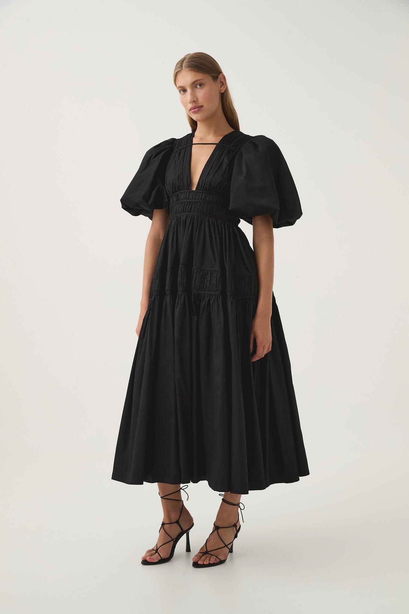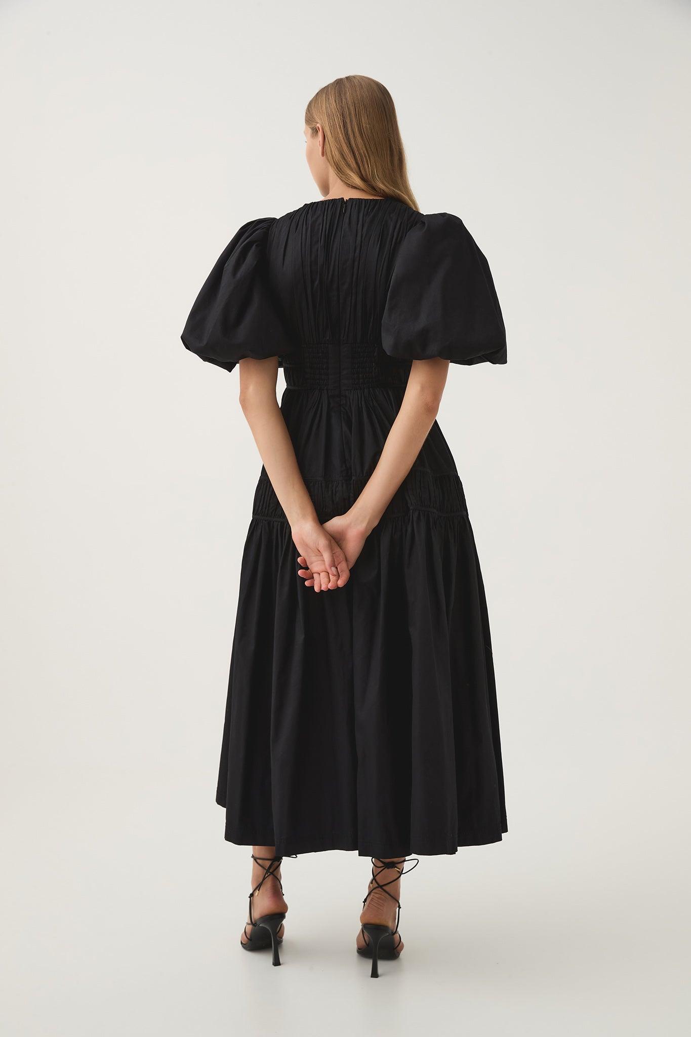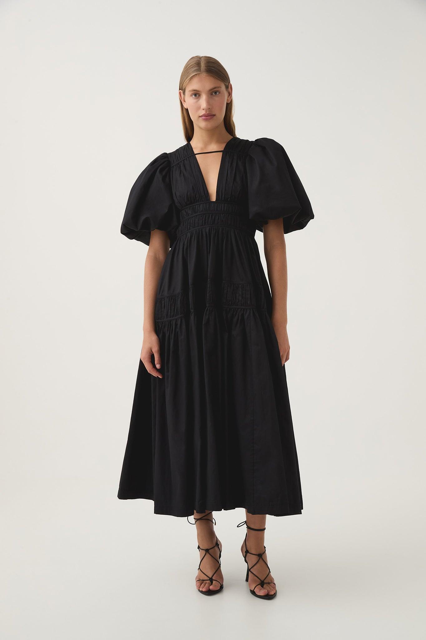 PRODUCT DETAILS Women's midi dress Deep V-neckline and horizontal strap detail Short puff sleeves Fitted waist with fixed drawcord panels Full skirt Side pockets Zip, hook and eye closure Lined style Shop All Dresses SIZE AND FIT Model wears a size 8/S Model: 170cm/5'7 Bust: 82cm Waist: 62cm Hips: 92cm FABRICATION 100% cotton Delicate Cold Hand Wash