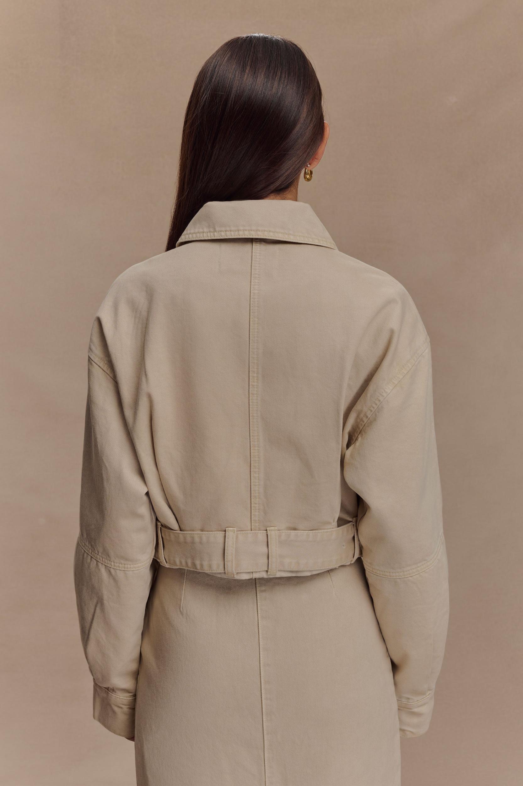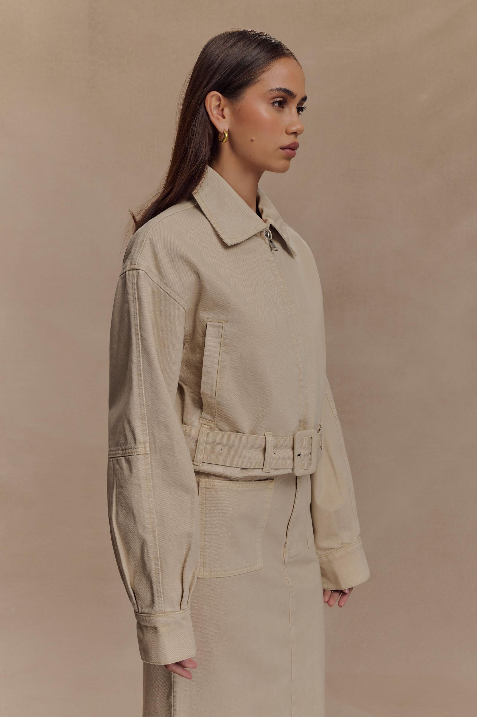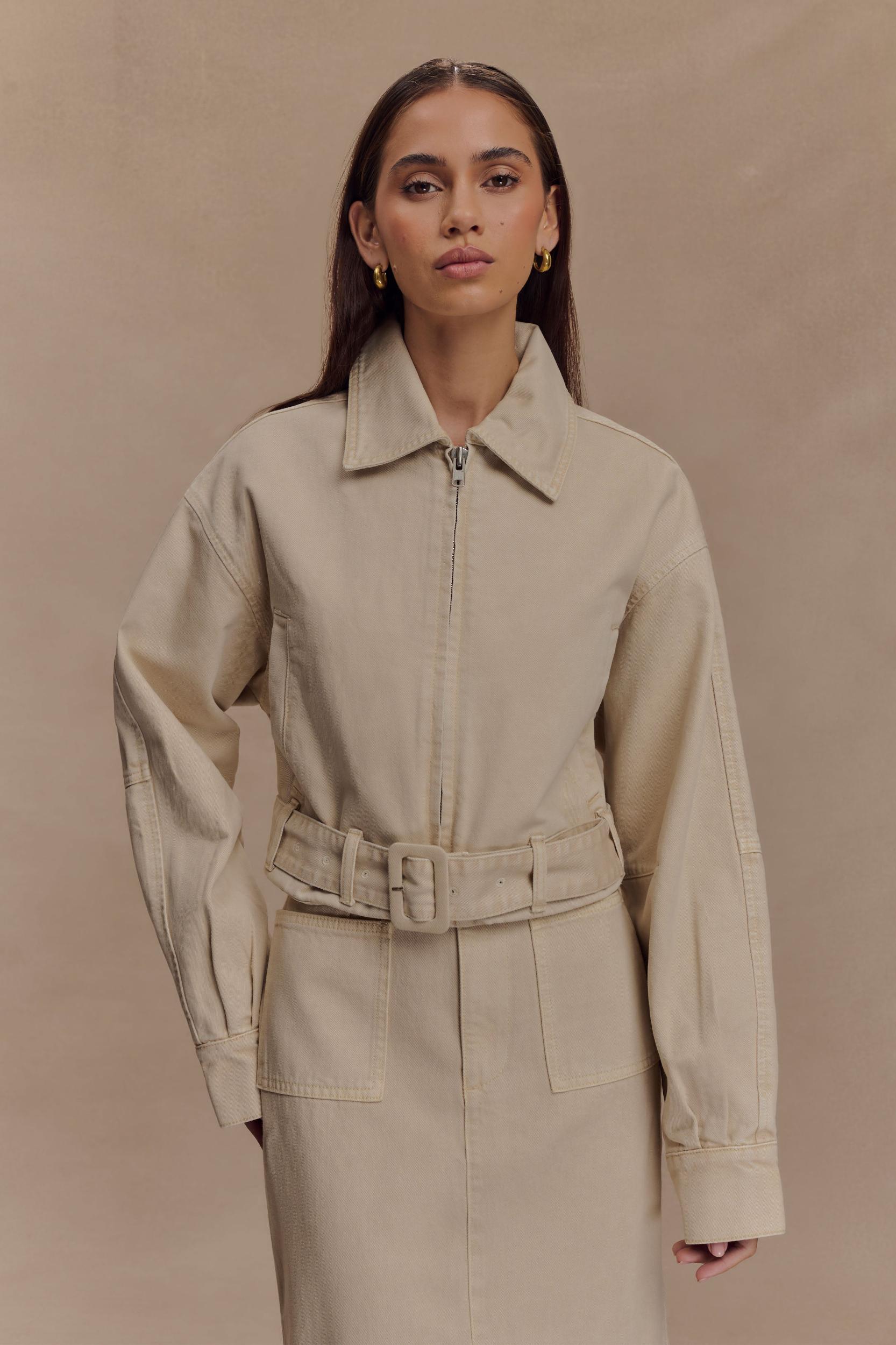 Desert night daze. The FALLON Cropped Denim Jacket is your go-to layering piece with a fresh edge. Featuring a collared neckline, front zip opening, and long sleeves, this unlined jacket is elevated by a waist belt and buckle with functional belt loops for a cinched silhouette. A slightly gathered hem adds a soft touch to its structured shape, making it the perfect blend of utility and style. Pair with the Fallon Denim Midi Skirt for a coordinated denim look that’s effortlessly modern.