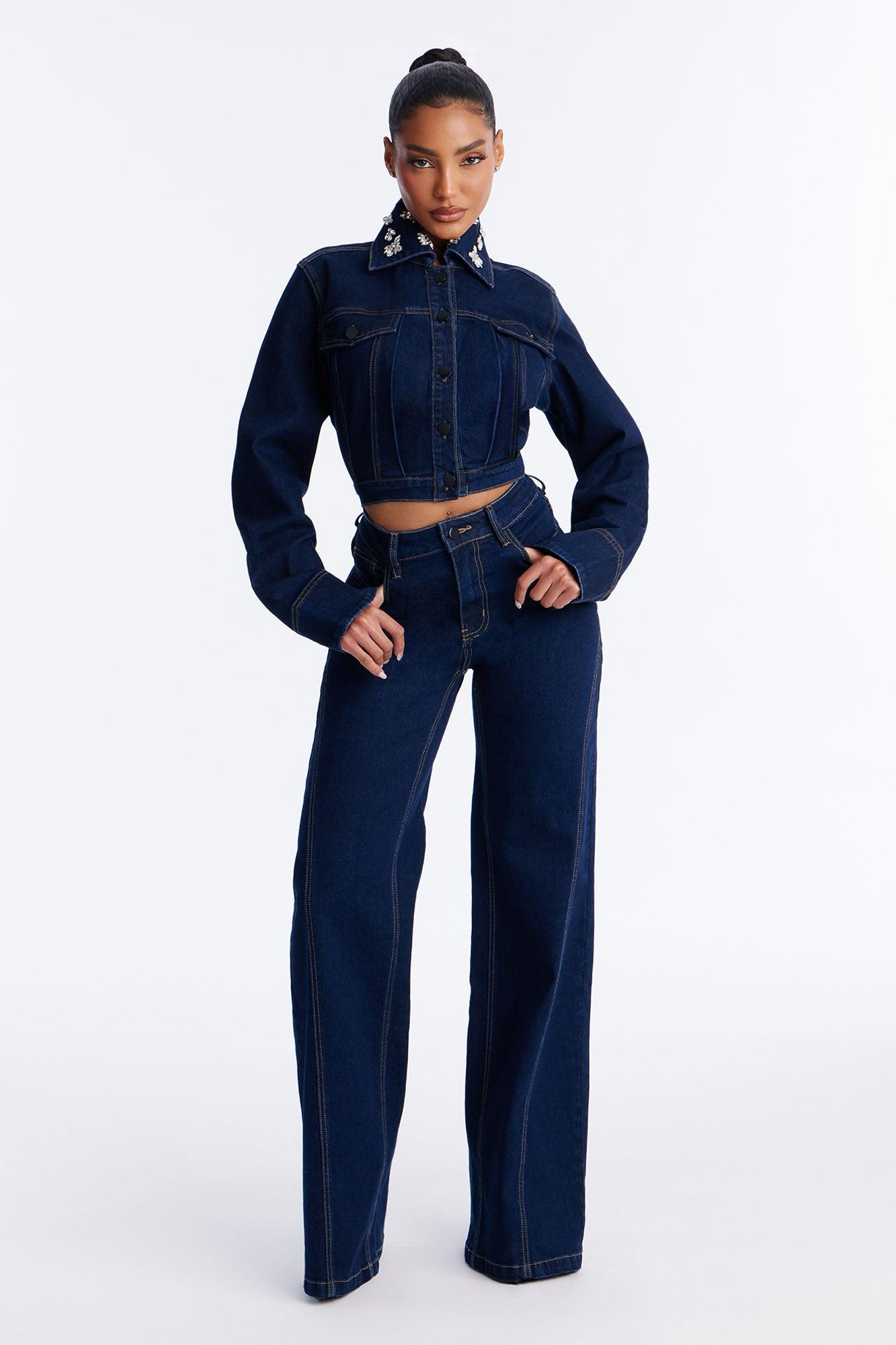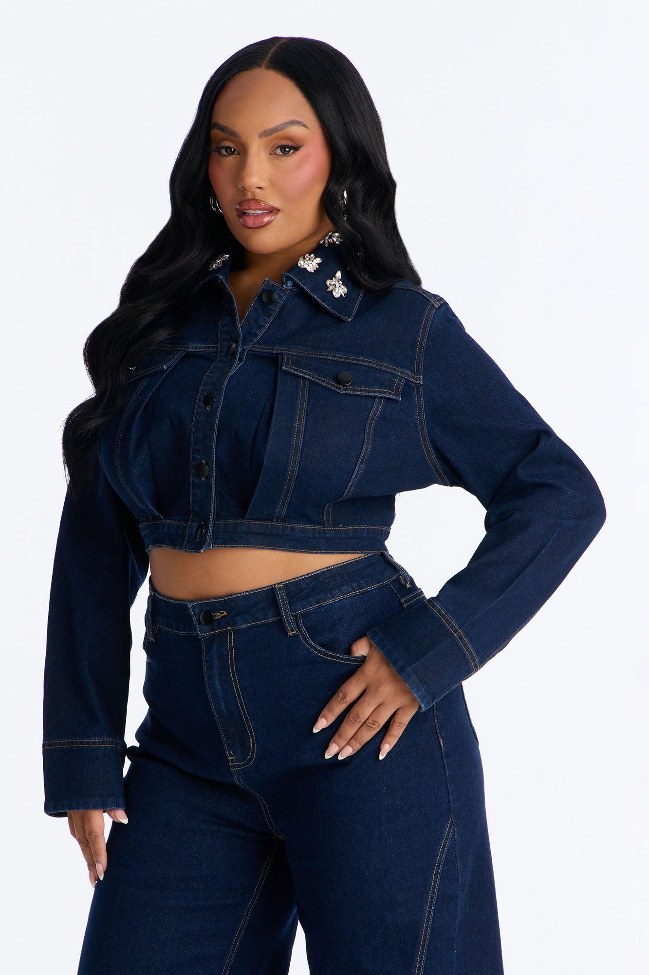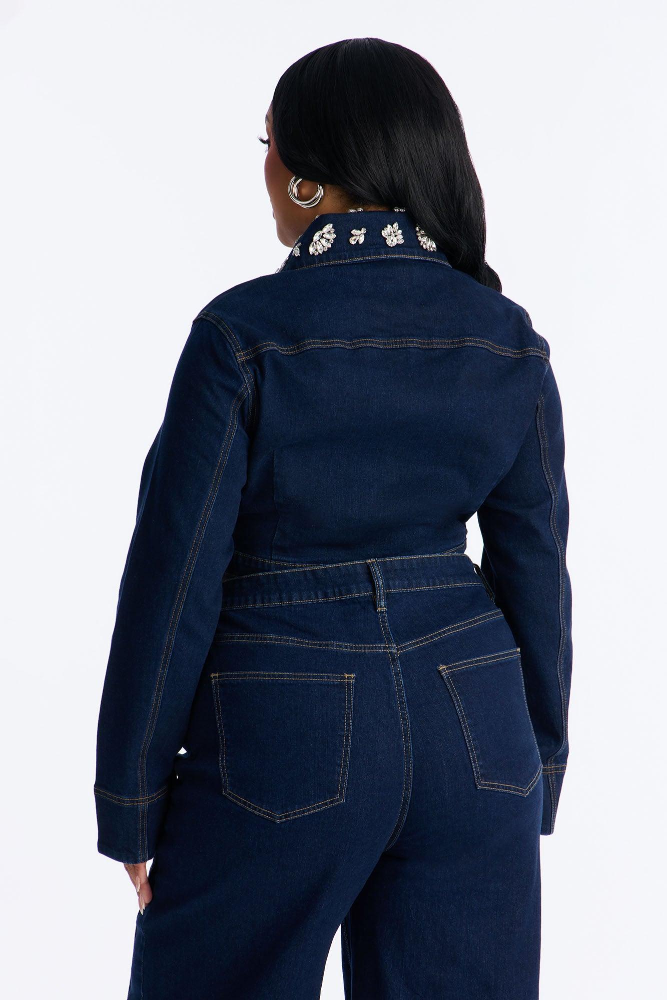 Available In Dark Wash. Pair With Fame And Fortune Embellished Jeans Denim Jacket Embellished Collar Long Sleeve Button Closure Low Stretch Disclaimer: Rhinestone Placement Will Vary. Self: 93% Cotton 5% Viscose 2% Spandex Imported