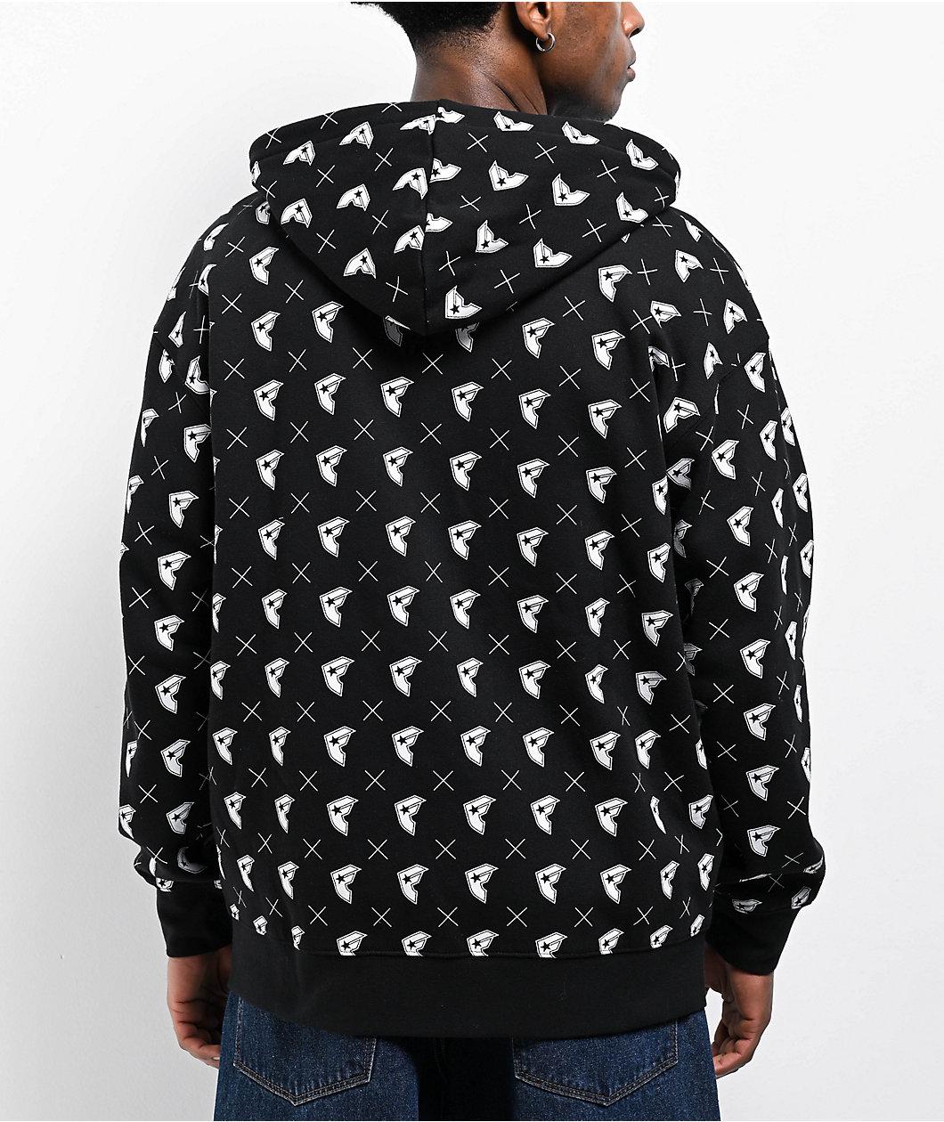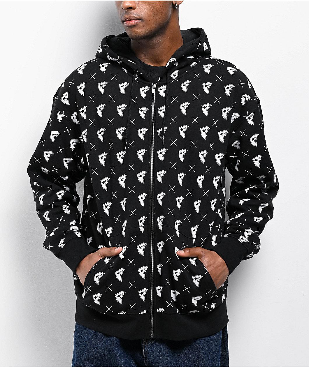 Introduced by Travis Barker's apparel brand Famous Stars & Straps in a solid black color scheme, the BOH zip hoodie features a Y2K-inspired print pattern throughout for a loud streetwear look. Showcasing repeated branding, the full zip sweatshirt emp