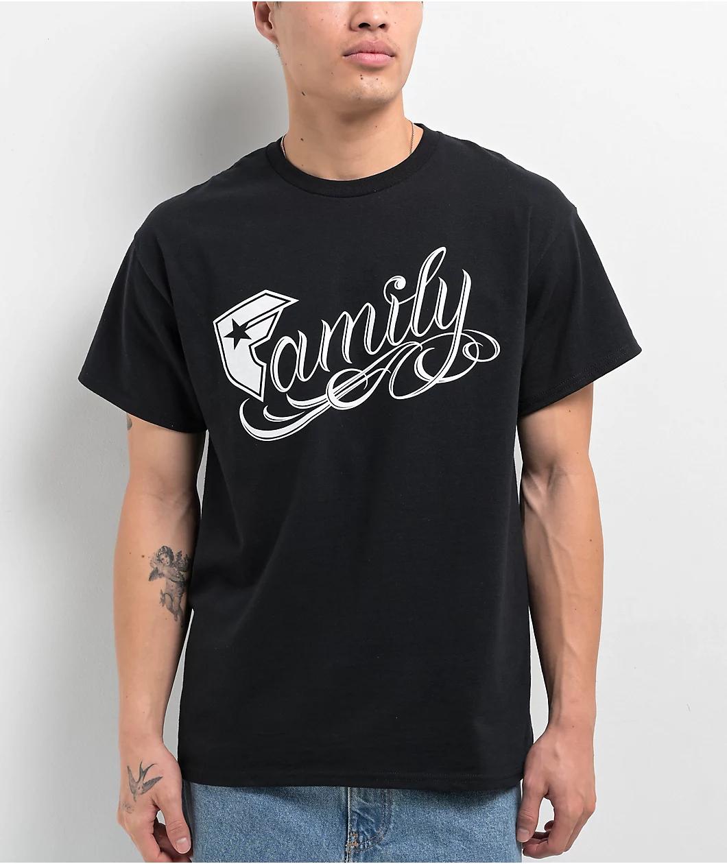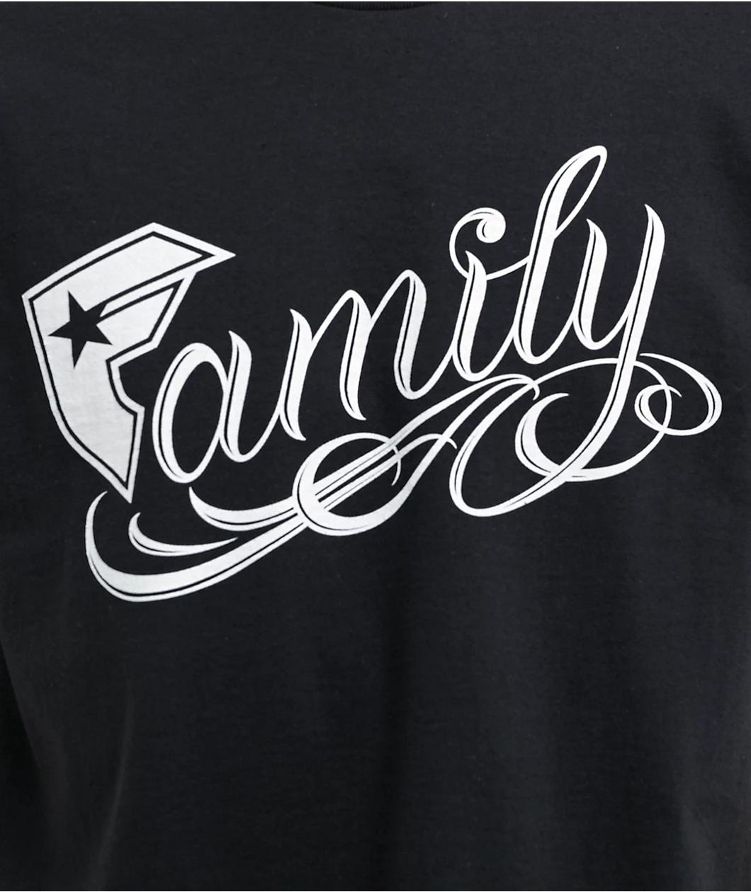 Add an alternative vibe to your outfit with the Famous Stars & Straps Family t-shirt with white screen-printed graphics on the front. Placed on top of a sleek black tee is "Family" in a cursive font with the "F" replaced with a renowned logo, deliver