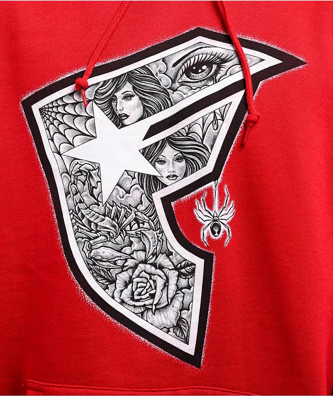 Arriving in a crimson red colorway, the Famous Stars & Straps Franco BOH hoodie features the classic F logo at the chest with black and grey tattoo imagery printed within. Finished with a soft brushed interior and kangaroo pouch pocket, the Franco BO