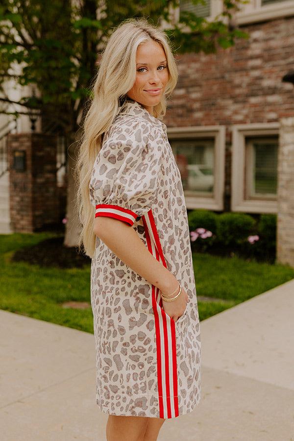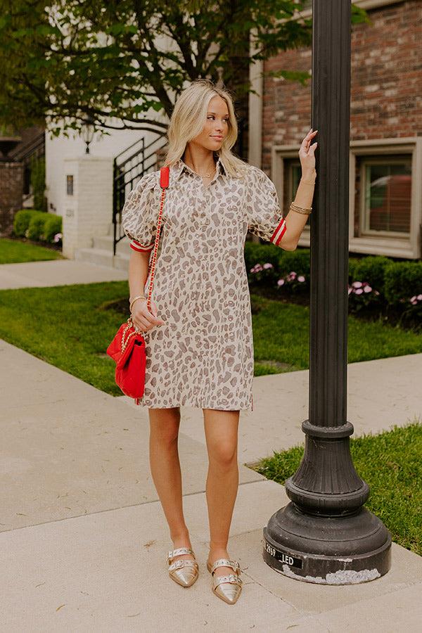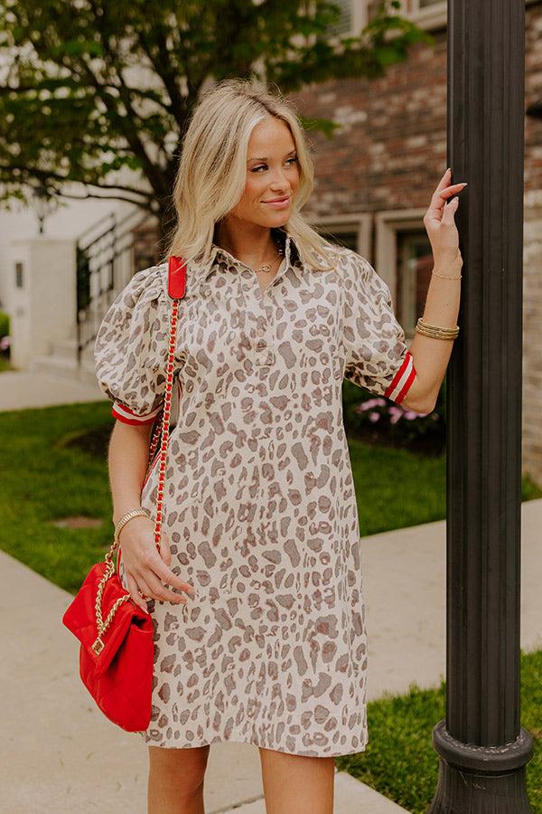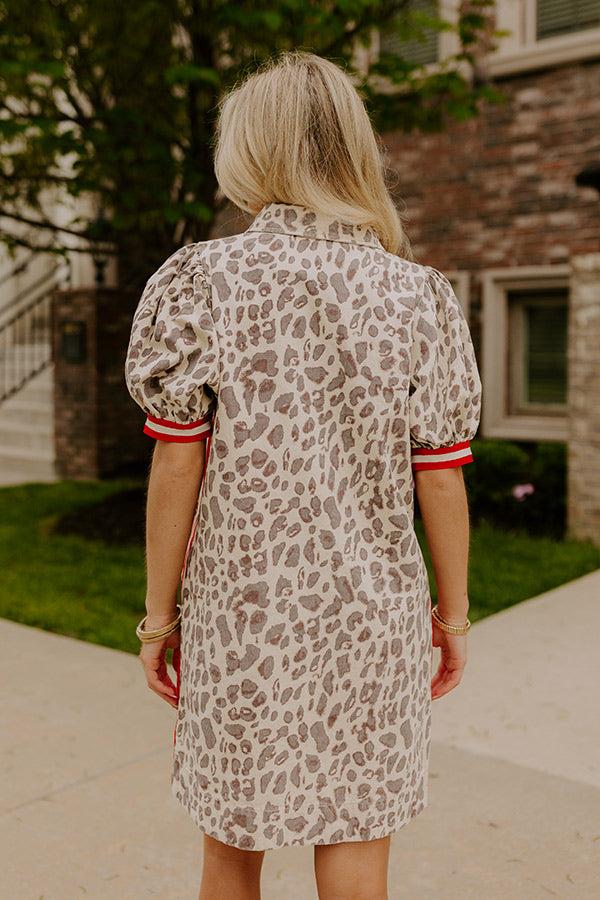 - This denim mini dress is a total cutie! Leopard print and striped accents add the sweetest trendy twist to your look. - Unlined denim material with a dark grey and hazelnut colored leopard print - A collared neckline - A three buttoned bodice - Short puff sleeves with cream and red colored cuffs - Cream and red striped accents down the sides - Functional side pockets - A relaxed silhouette that ends in a straight, mini dress length hemline