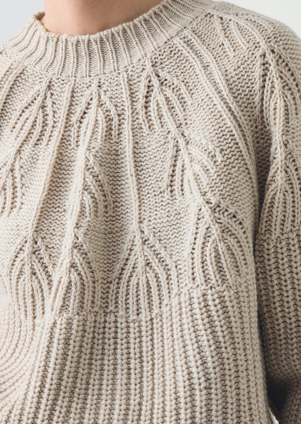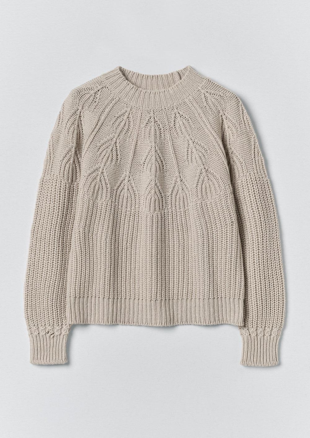 Intricate fan stitches frame the yoke of our sweater. Knitted from a blend of wool and cotton to an easy shape with raglan sleeves and ribbed edges.