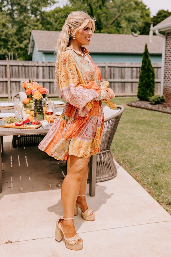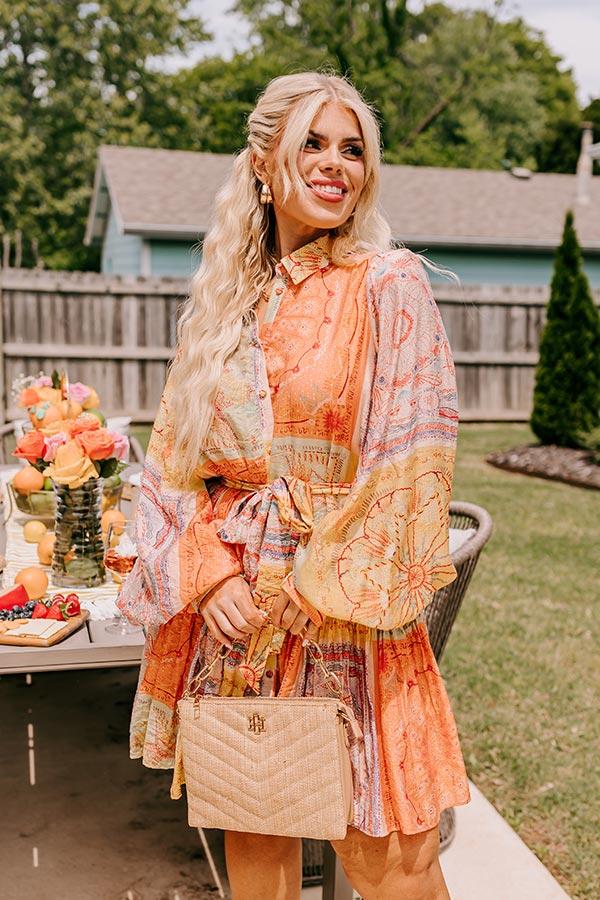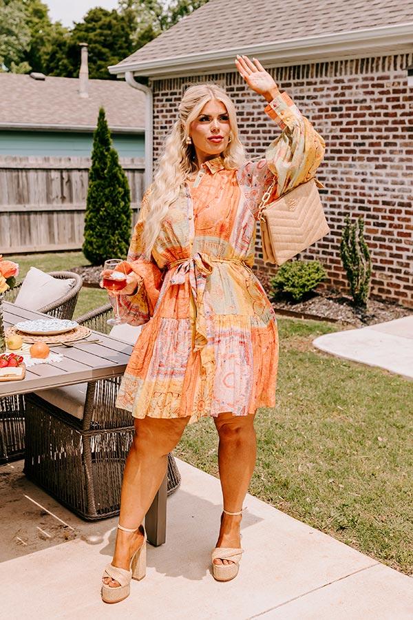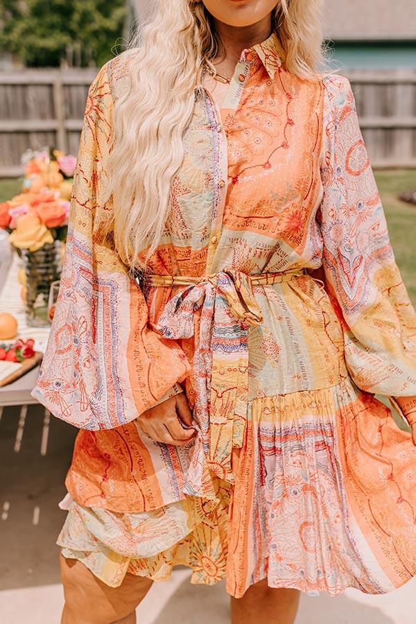 - Stay patchwork pretty in this beautiful dress! - Lightweight material with panels of different colorful prints - A collared neckline - A buttoned front that ends just above the hemline - Long, loose sleeves with button closure cuffs - A waistline with belt loops and a removable tie closure belt - A relaxed yet flattering silhouette that ends in a mini dress length hemline