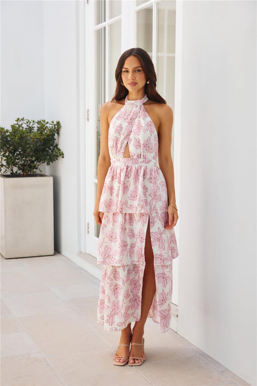 Fancy Garden Party Halter Plisse Maxi Dress Pink