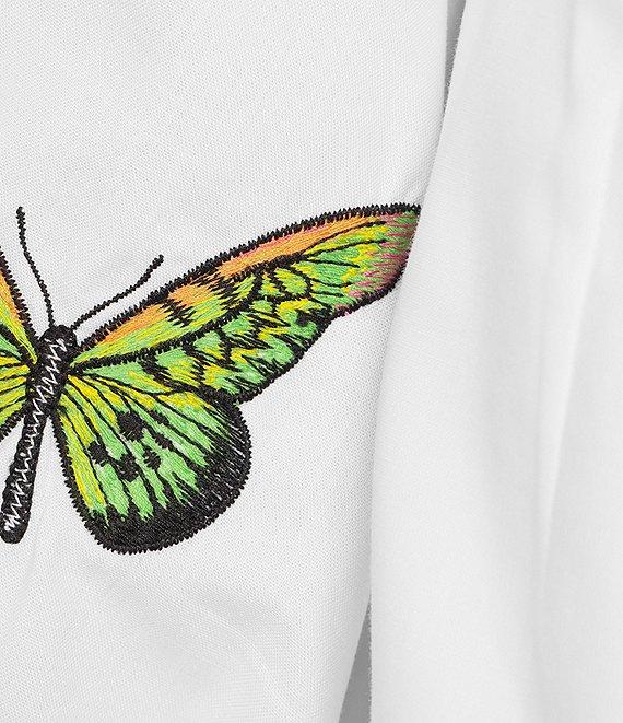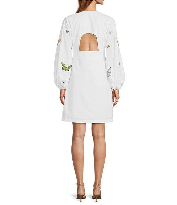 From Fanm Mon, this dress features:V-necklineHand embroidered butterfly detailingLong bell sleevesSide zipper UnlinedMini lengthCotton Dry clean or hand wash onlyImported.