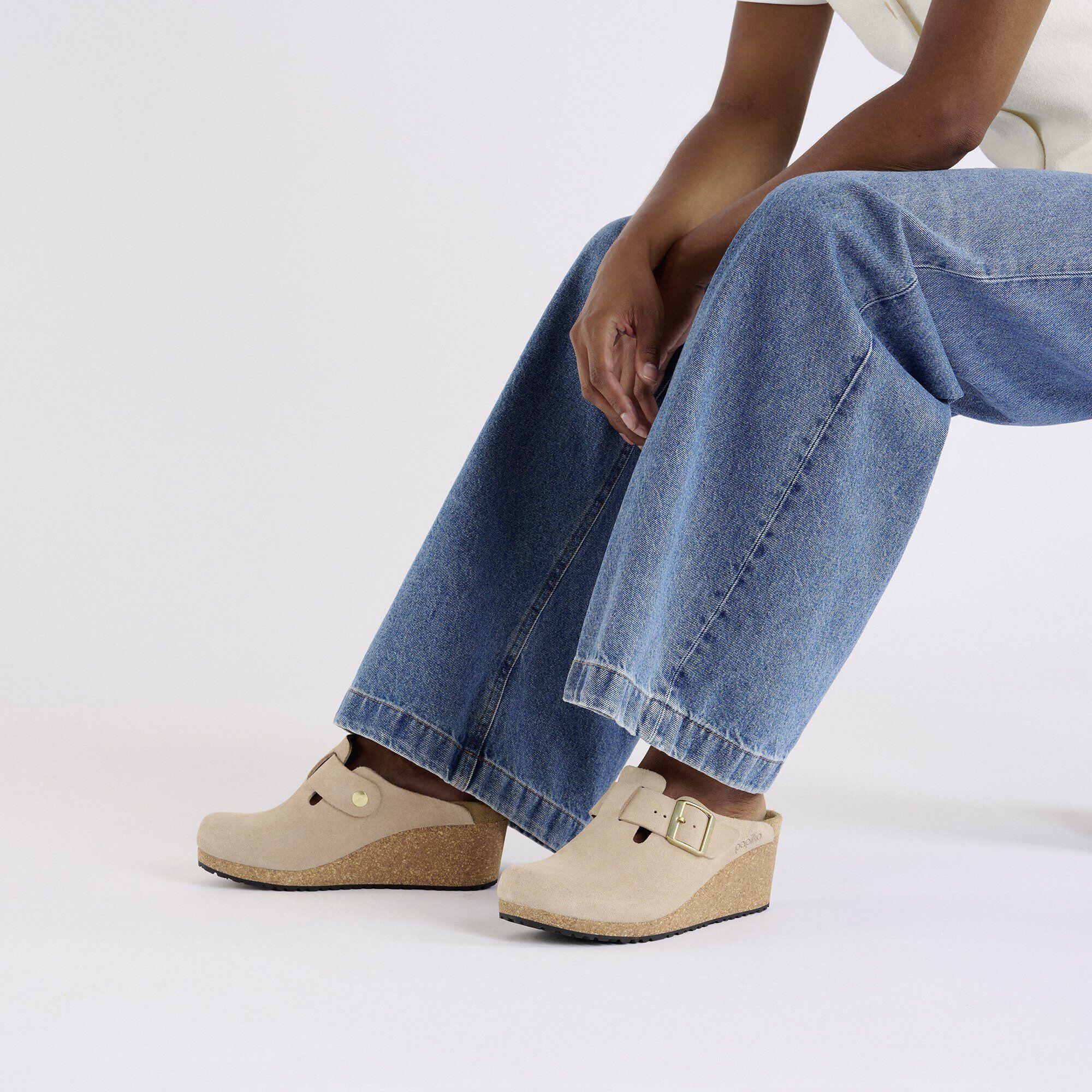 The clog Fanny by Papillio boasts an elongated simple upper part. The wedge heel lengthens the leg and makes the clog appear less chunky. Its natural design is down to the upper made from especially soft suede, which hugs the foot like a second skin.