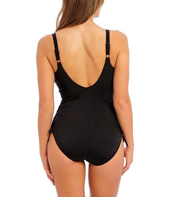 From Fantasie, this one piece swimsuit features:Tank silhouetteV-neckline Underwire Extended bra sizingAdjustable straps Ladder trim at neckline Side adjustable string Front wrap detailMetallic gold aprex trim detailModerate coverage Lined Pull-on constructionPolyamide/elastaneHand washImported
