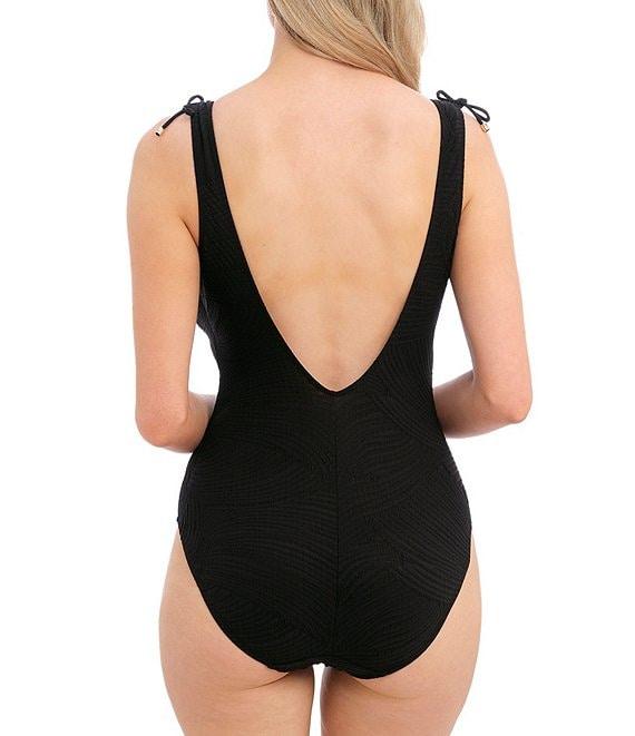 From Fantasie, this one piece swimsuit features: Tank silhouette Plunge v-neckline Underwire Extended bra sizing Metallic gold bead detail Moderate coverage Scoop back Lined Pull-on construction Polyamide/elastane Hand wash Imported. All styles are sold in UK sizing. Please reference the size chart for US and other conversions.
