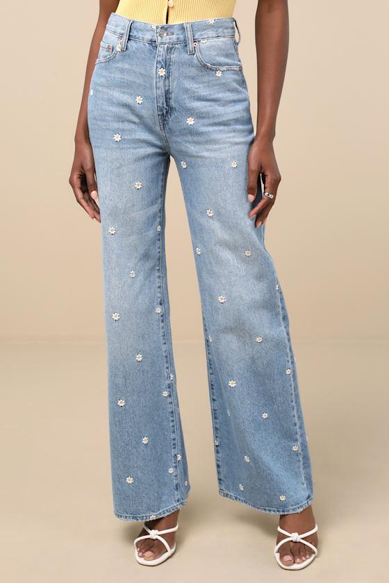 Designed for day dates, picnics, and effortlessly cute moments, these updated jeans by DAZE Denim feature daisy-inspired floral embroidery for a too-cute aesthetic. Sturdy denim (in DAZE Denim's Daze-y wash) shapes a high-rise fit with belt loops, a hidden zip fly with a top button closure, and a classic five-pocket cut. Light whiskering accents the wide pant legs that fall to finished, full-length hems.
