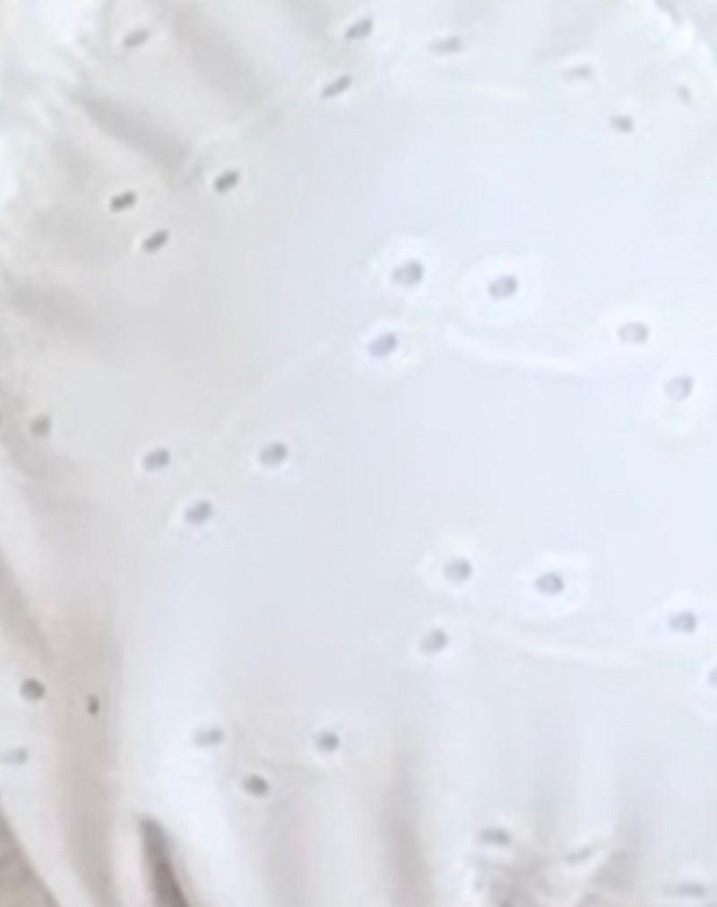 Low rise bikini bottoms with a high leg shaping finished with a layered picot trim and frill along the waistband in a white broderie swim fabric. We love to wear with the matching Pumyla bikini top. MODEL WEARS SIZE:EXTRA SMALL - MODEL HEIGHT:5'6.5
