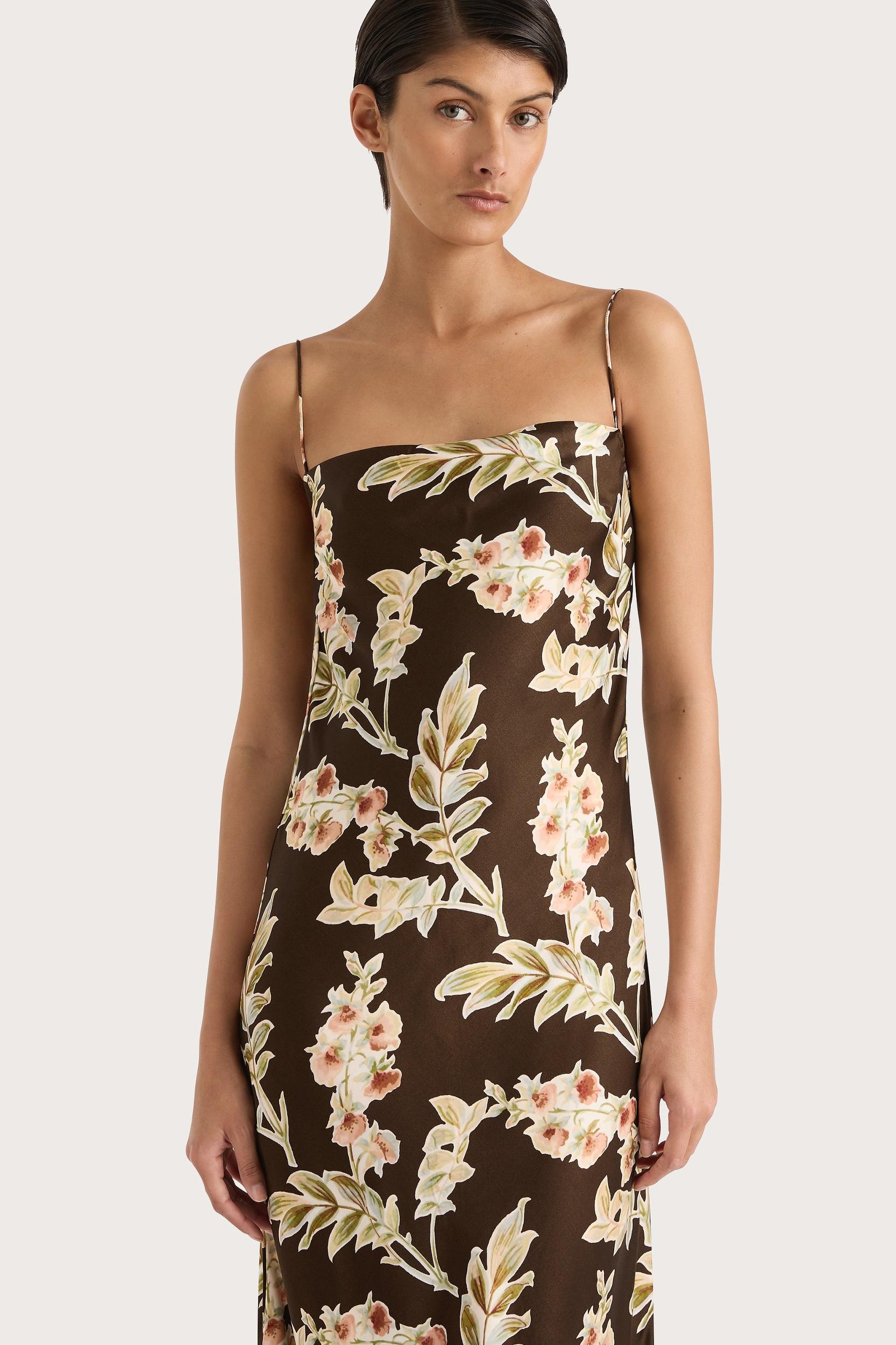 An elegant maxi dress, designed from an ultra-soft and luxurious blend of viscose and rayon in a deep chocolate brown colourway with a vintage-inspired floral motif, inspired by references from the golden age. It has a high round neckline with long straight sleeves and a backless bodice with delicate tie detailing at the neck and mid back. The silhouette features a bias cut and a floating skirt with a slight flare that crops below the ankles. Style with a heel for transeasonal occasionwear.This style is true to size. Please note that while there are back ties, they do not alter the fit.