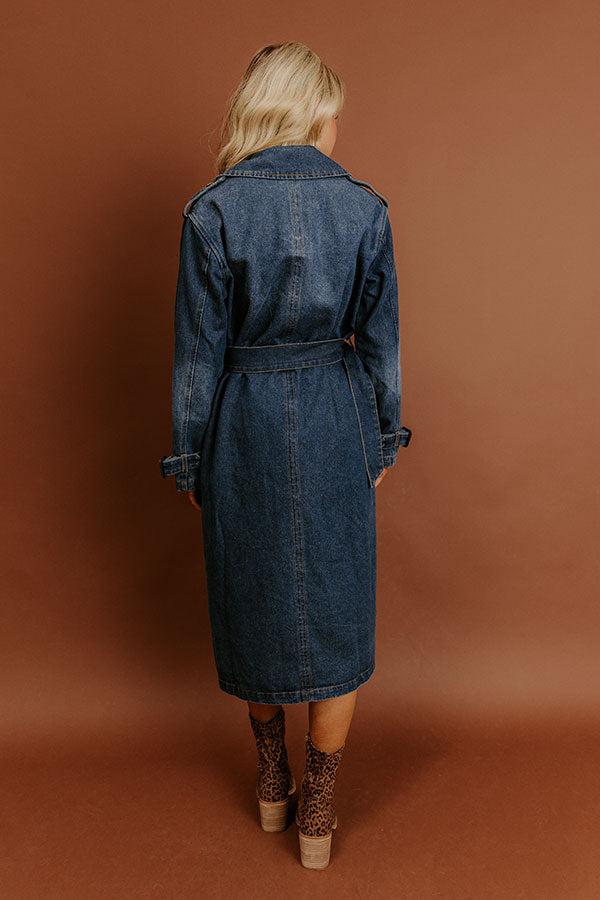 - Strut through your day with this chic trench coat! Its flattering silhouette and timeless denim material make it a stylish pick for effortless layering all season long. - Unlined denim material - A collared v-cut neckline - A buttoned front - Long sleeves with belted cuffs - Belt loops and a removable belt featuring a brown colored faux leather buckle - Functional front pockets - A flattering belted silhouette that ends in a straight hemline