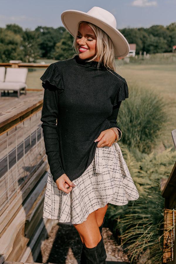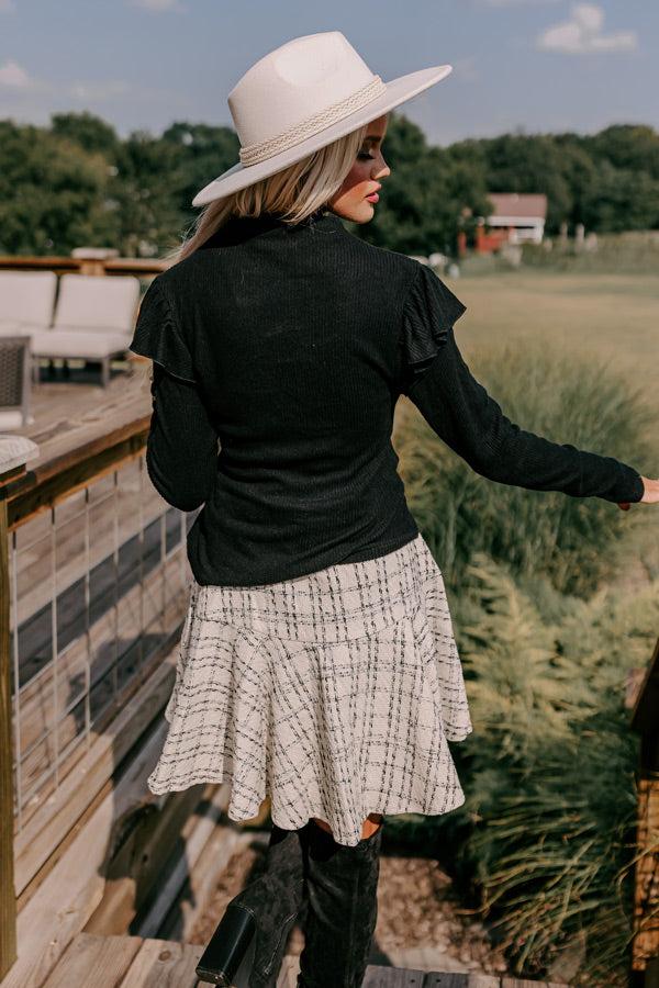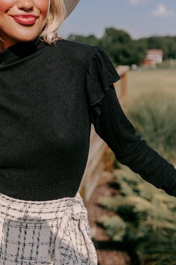 - This casual top is a stylish twist on the classic ribbed top! - Ultra-soft ribbed material - A mock neckline - Ruffled shoulder detail - Long sleeves - A relaxed yet flattering silhouette that ends in a straight hemline