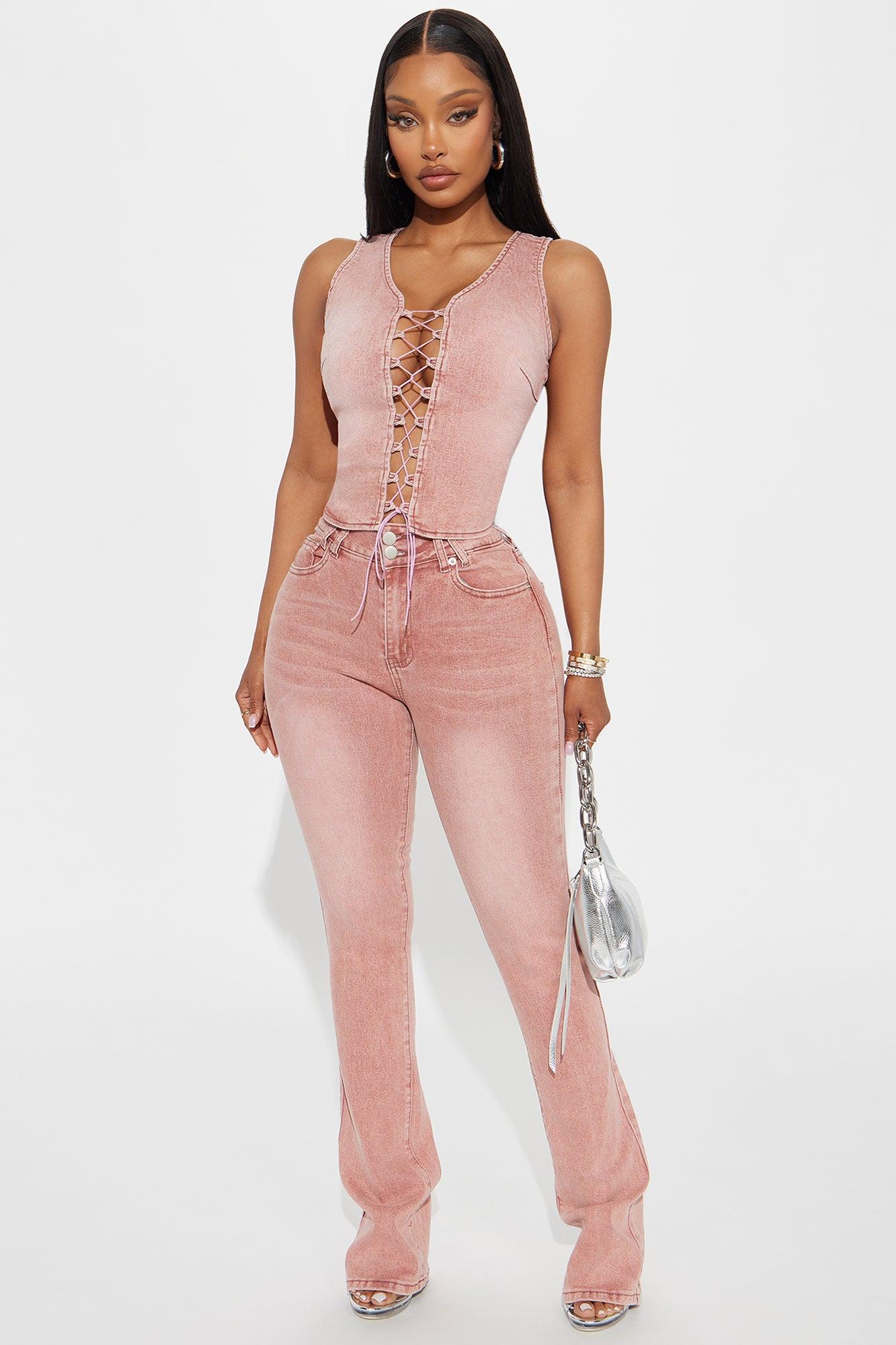 Available In Pink. Pair With Fatal Attraction Lace Up Denim Top Bootcut Jean 5 Pocket Double Button Closure 10.5" High Rise 34" Inseam 50% Cotton 26% Viscose 22% Lyocell 2% Spandex Disclaimer: Due To The Specialized Wash Process, Each Garment Is Unique. High Stretch Imported California Proposition 65 WARNING: Cancer and Reproductive Harm - www.P65Warnings.ca.gov.