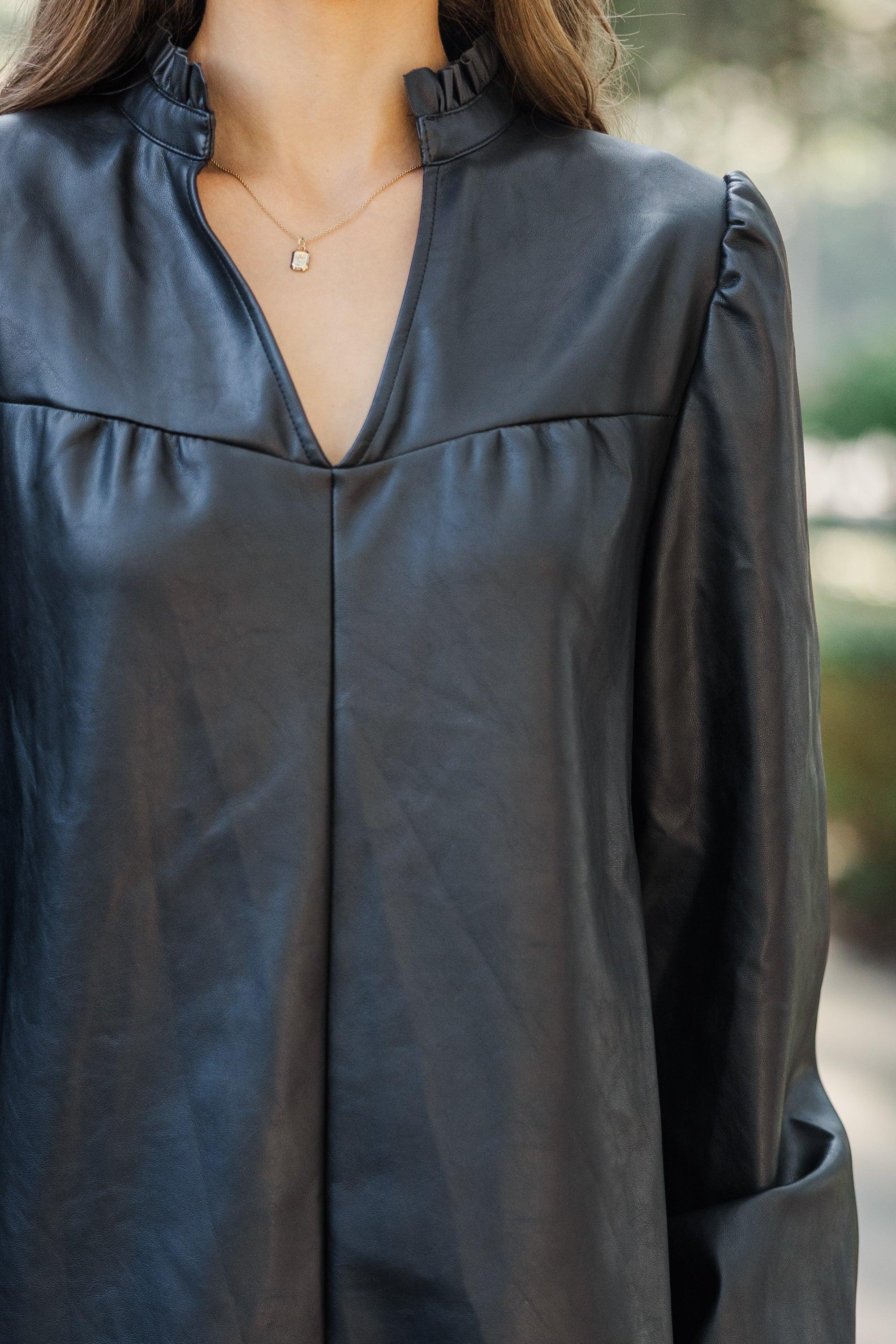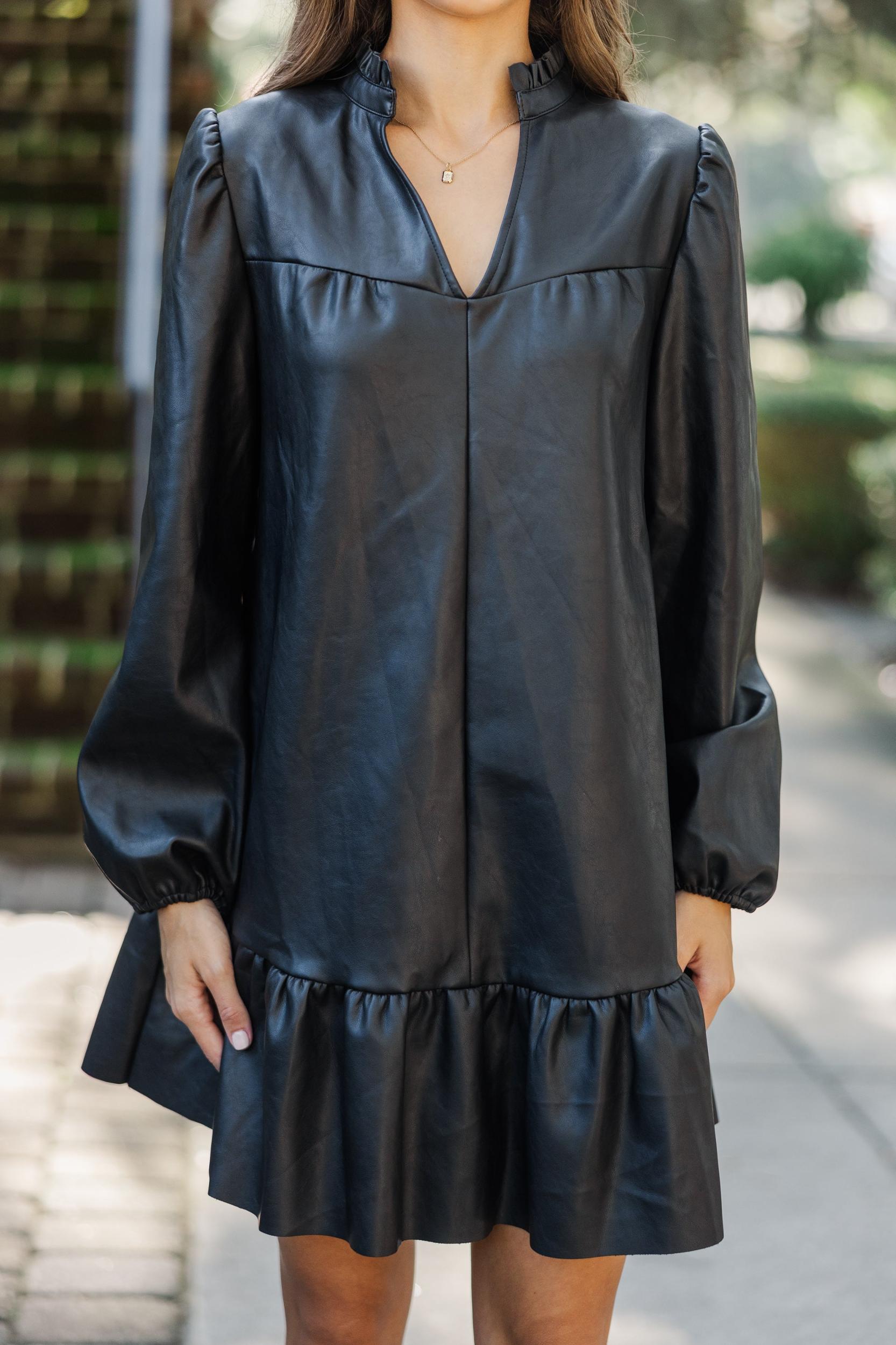 This faux leather dress is so edgy and chic! The fabric is also perfect for the fall season! You are going to love styling this faux leather dress with all sorts of boots and booties! V-neckline Long sleeves Drop waist Faux leather fabric Minimal stretch Sydney is wearing the small.
