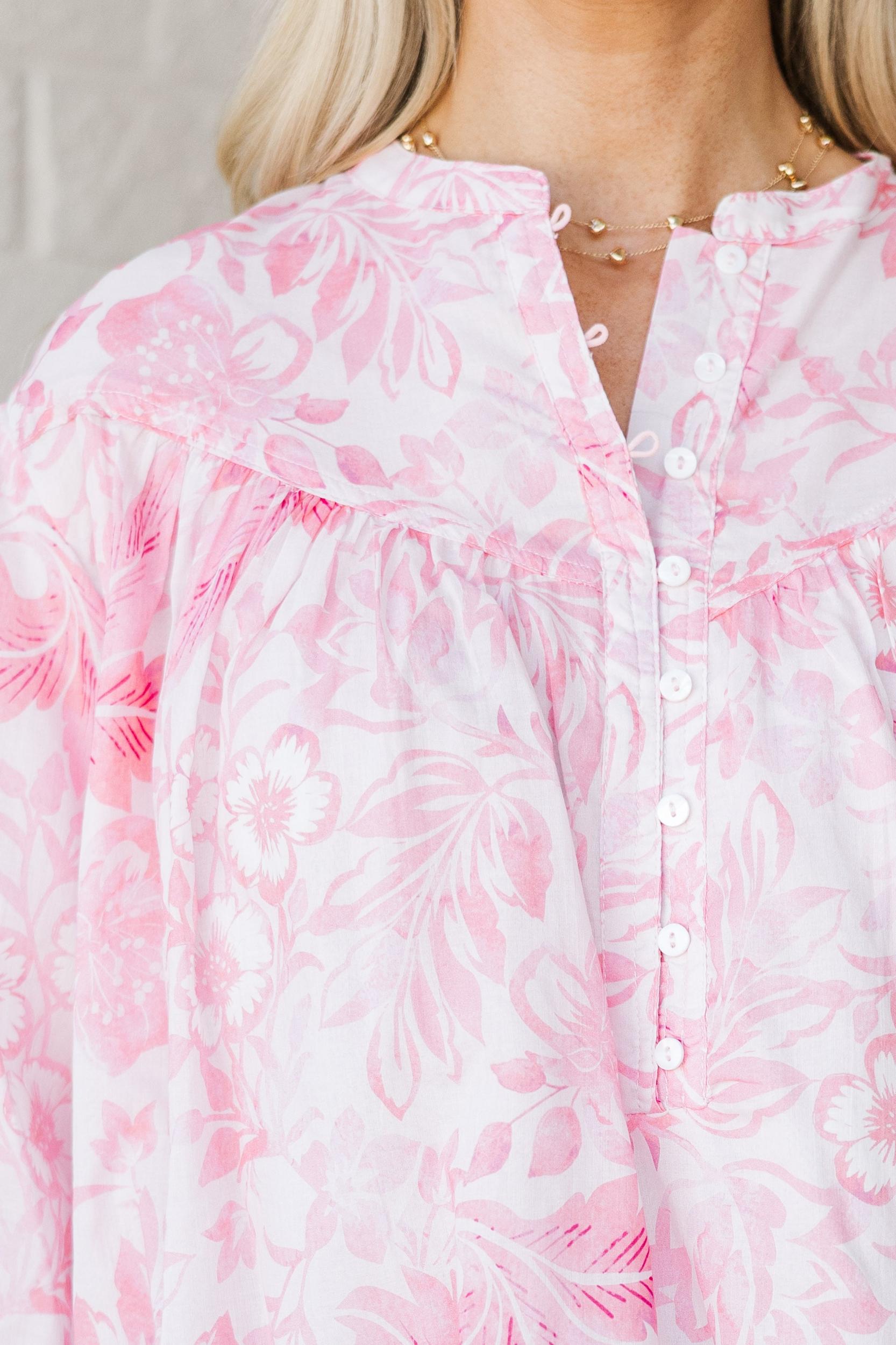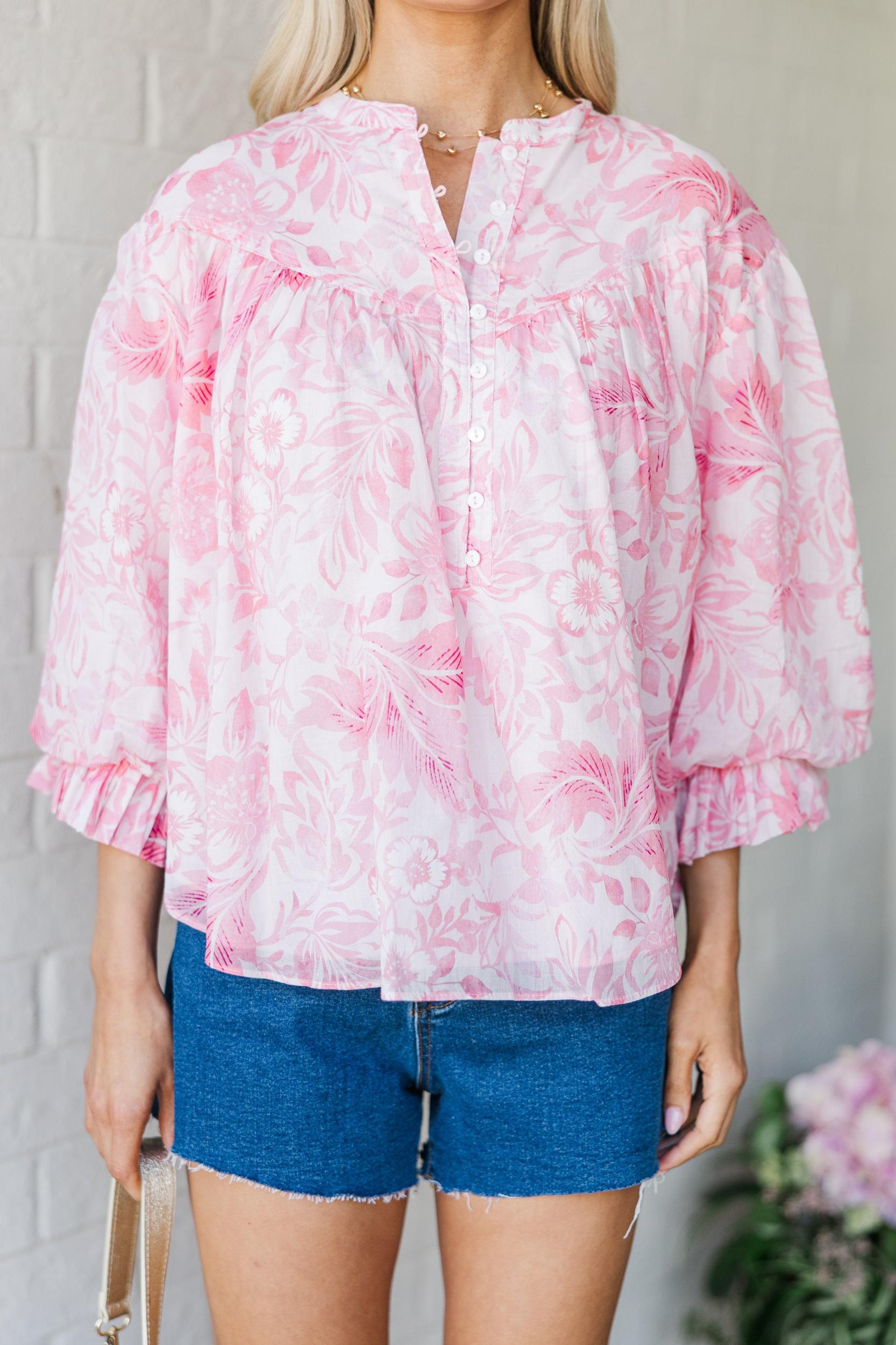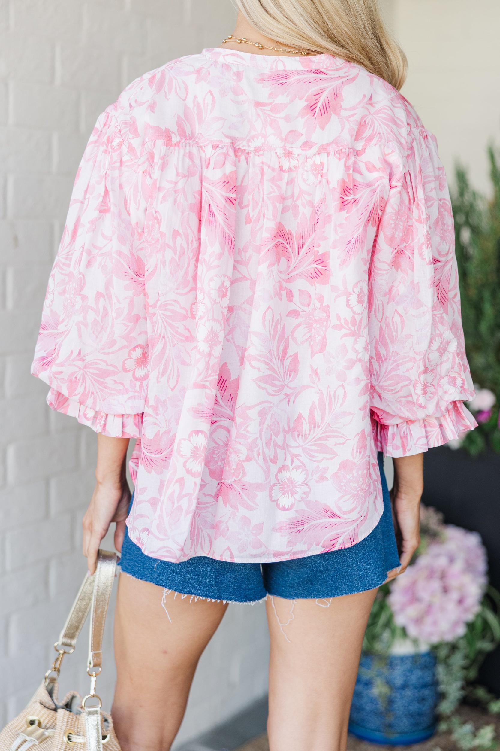 This pink floral blouse is pure sunshine in a top! With its breezy silhouette, subtle sheen, and romantic tone-on-tone floral pattern, it's an easy favorite for everything from office hours to happy hour. The button-front detail and billowy sleeves add just the right amount of charm. Pair it with jeans or dress it up with white pants—either way, you're going to look effortlessly fab! Partial button down round neckline 3/4 bubble sleeves Floral print Material has no amount of stretch Baileigh is wearing the small.