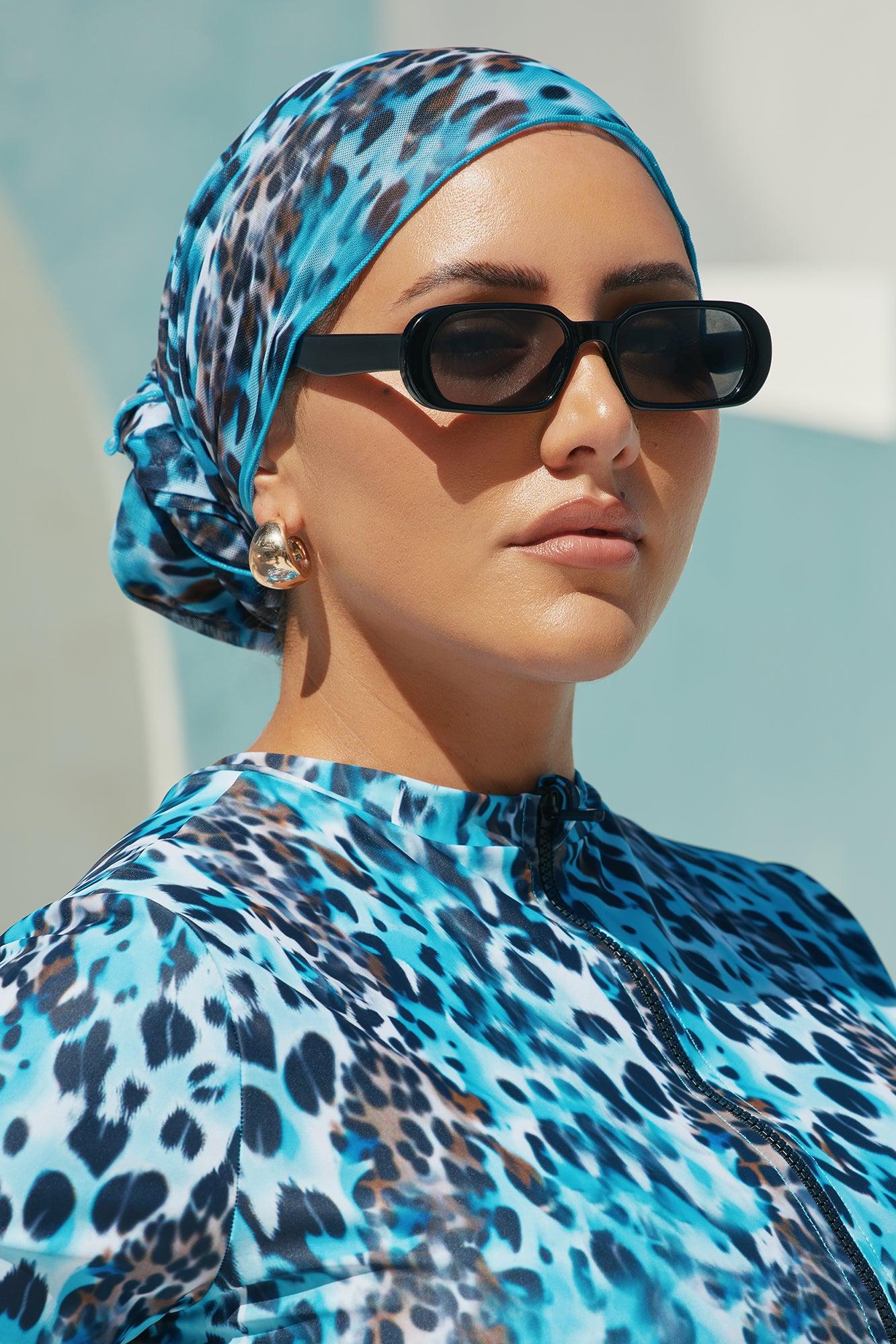 Available In Blue/combo. 3 Piece Burkini Swimsuit Set Leopard Print Swim Shirt, Short Sleeves Removable Cups Zipper Closure Swim Capri Pants Printed Swim Mesh Sarong, Printed Mesh Adjustable Full Stretch Final Sale Disclaimer: Print Placement May Vary. Shell/Sarong: 85% Polyester 15% Spandex Lining: 92% Polyester 8% Spandex Imported
