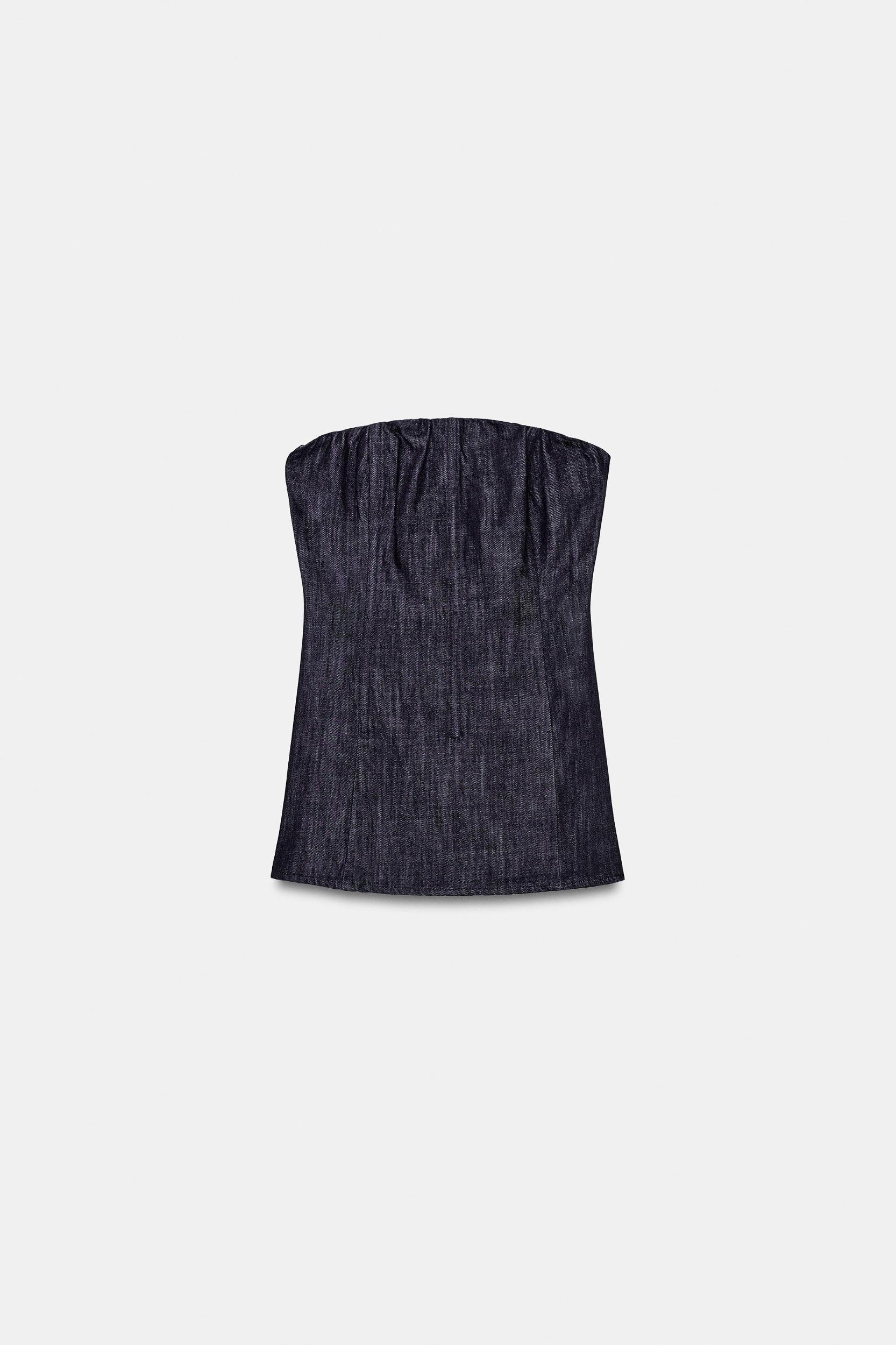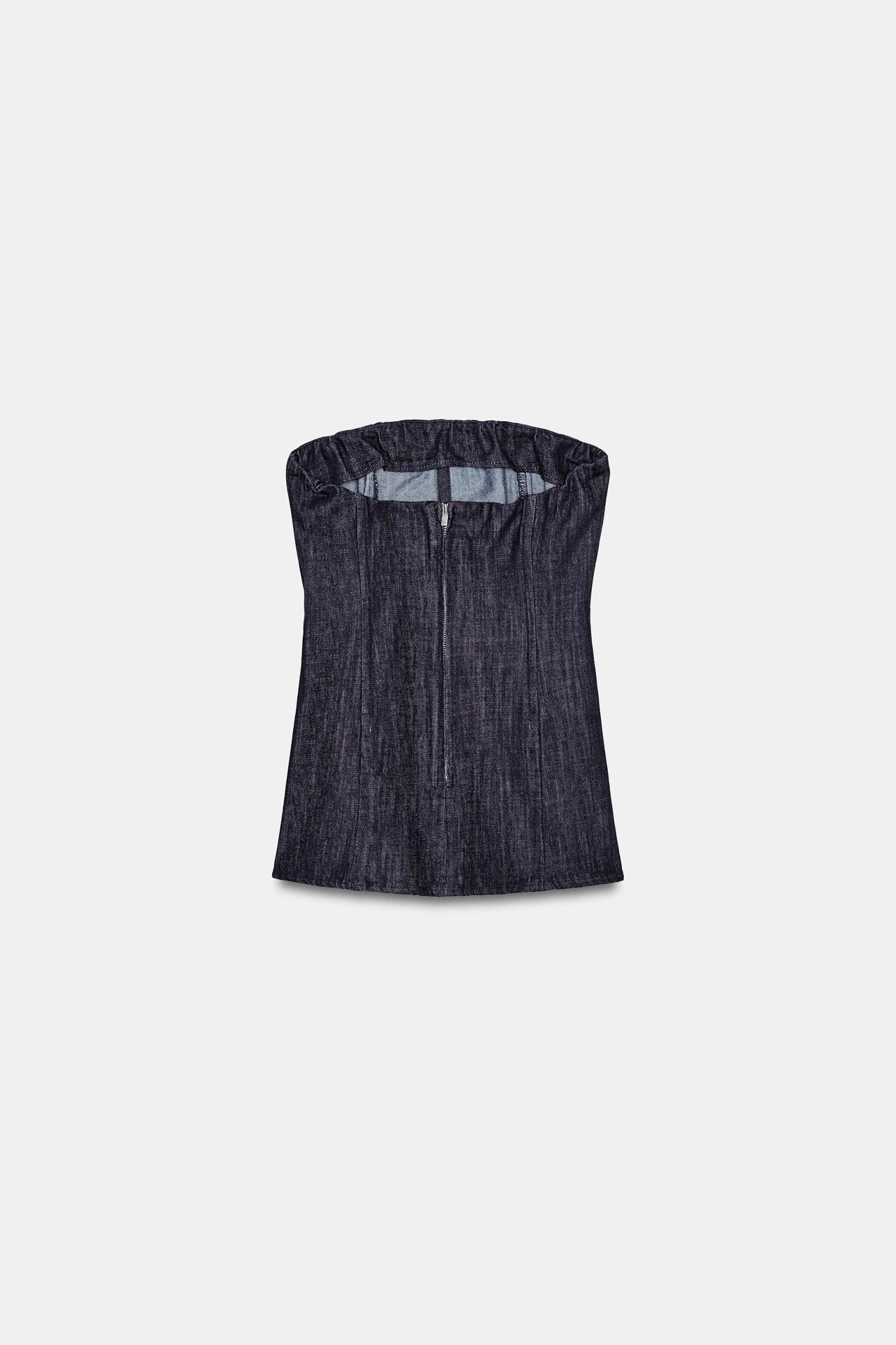 Bustier top with elastic straight neckline and exposed shoulders. Internal boning detail that enhances and stylizes the figure. Flared hem. Back metal zip closure.