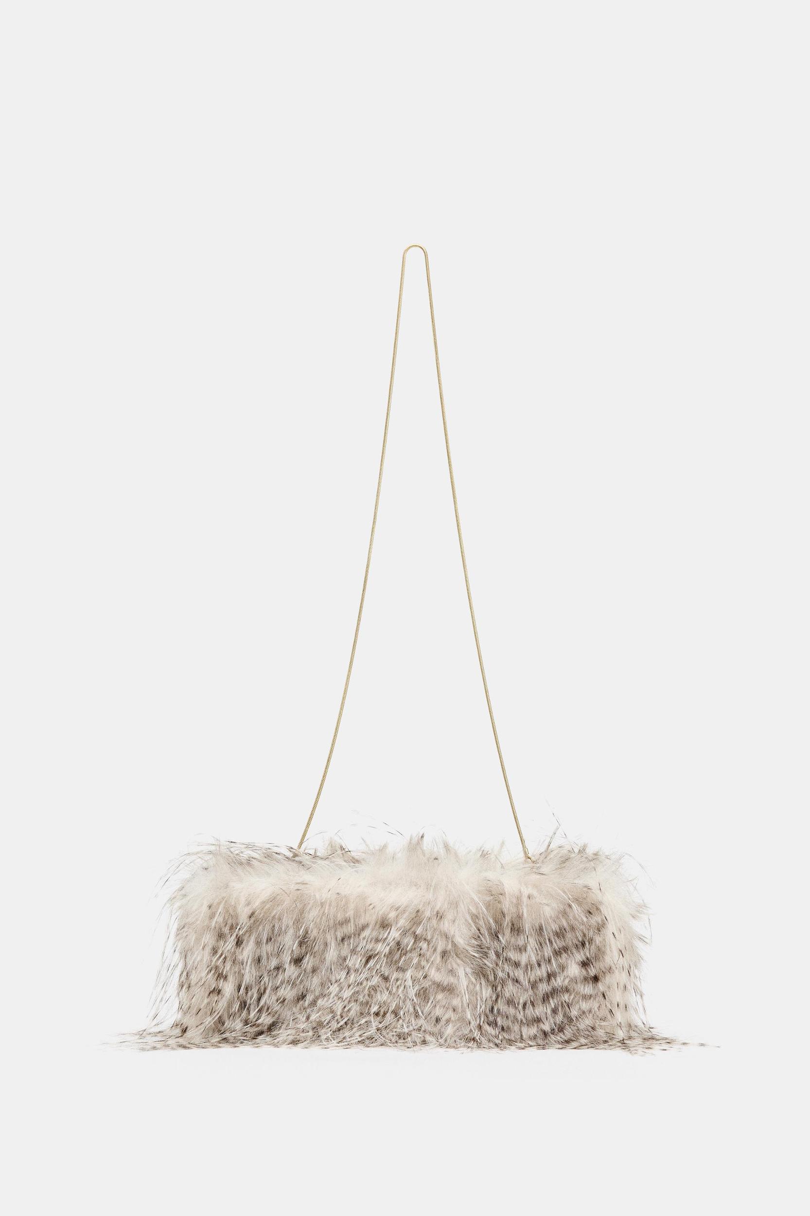 Elongated clutch bag. Faux fur body. Chain crossbody strap. Interior lining. Magnetic clip closure. Height x Length x Width: 4.3 x 11 x 2 inches (11 x 28 x 5 cm)