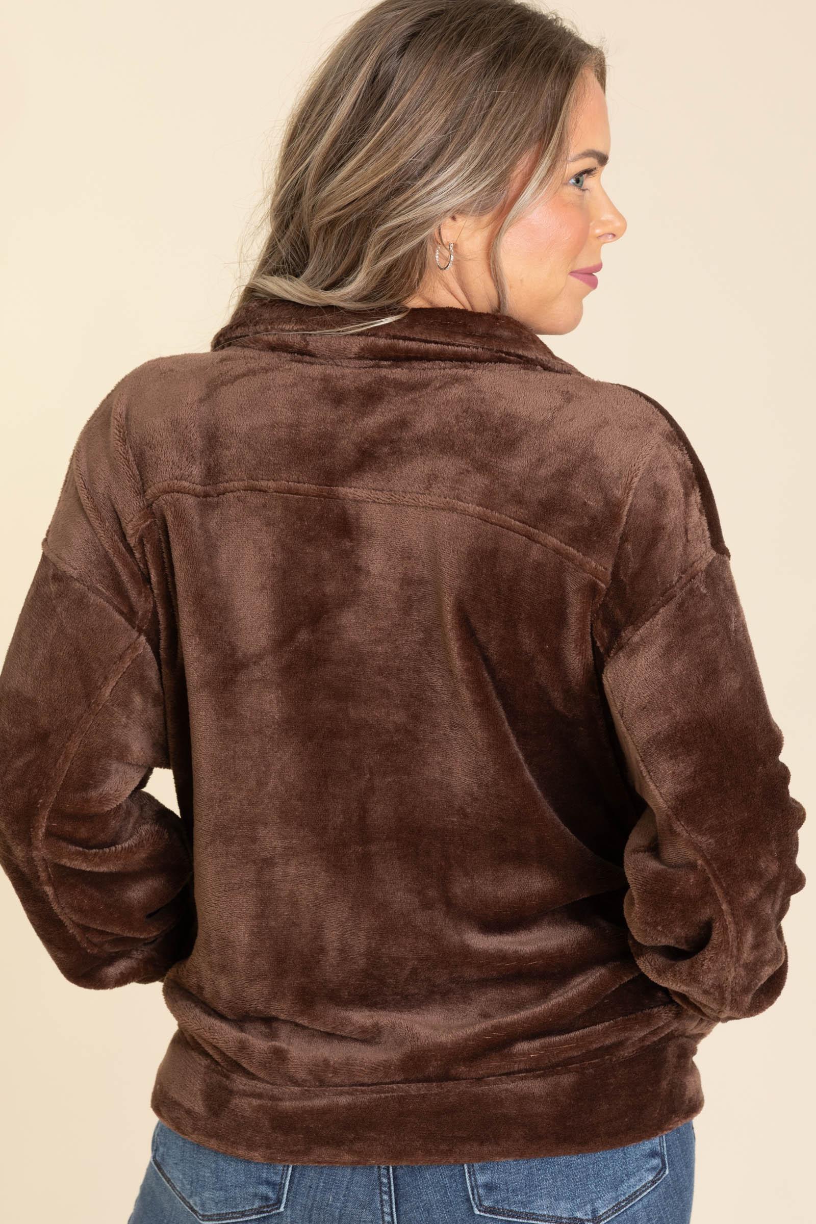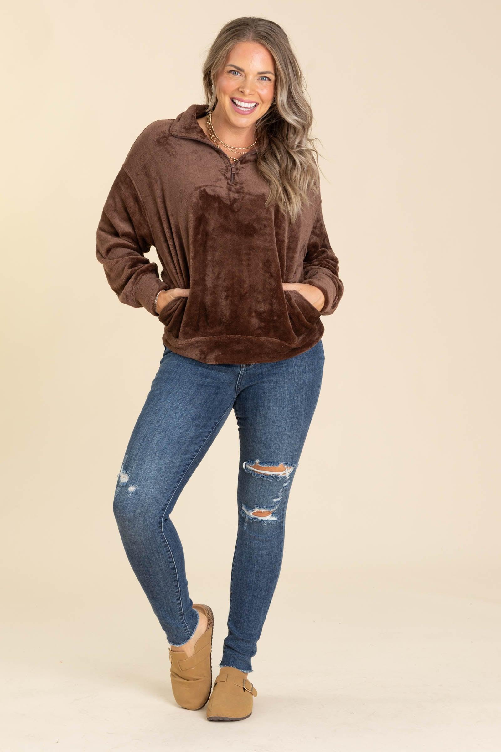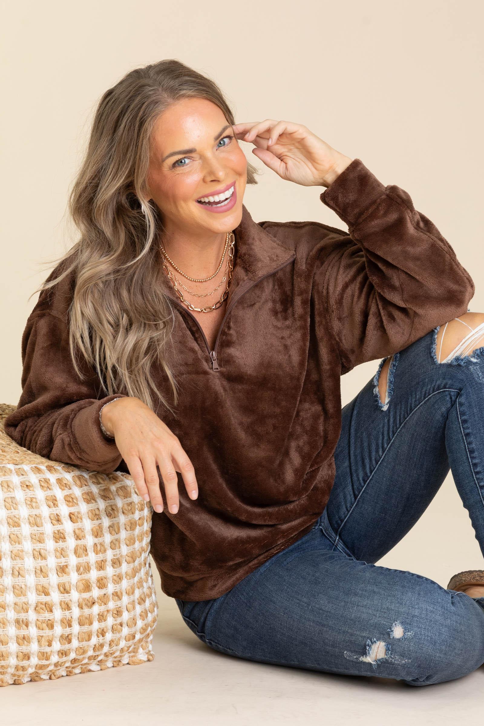 Product Details Colors: Ash Mocha, Brown Print: Solid Neckline: 3/4 Zip Sleeve: Long Sleeve Hemline: Straight Brand: Zenana Material and Care 100% Polyester Machine Wash Cold Hang/ Line Dry Size and Fit Small: Bust 46" Waist 44" Length 25" Medium: Bust 48" Waist 46" Length 25.5" Large: Bust 50" Waist 48" Length 26" Erica is 5’7” and wearing her true size small Sarah is 5’8” and wearing her true size small
