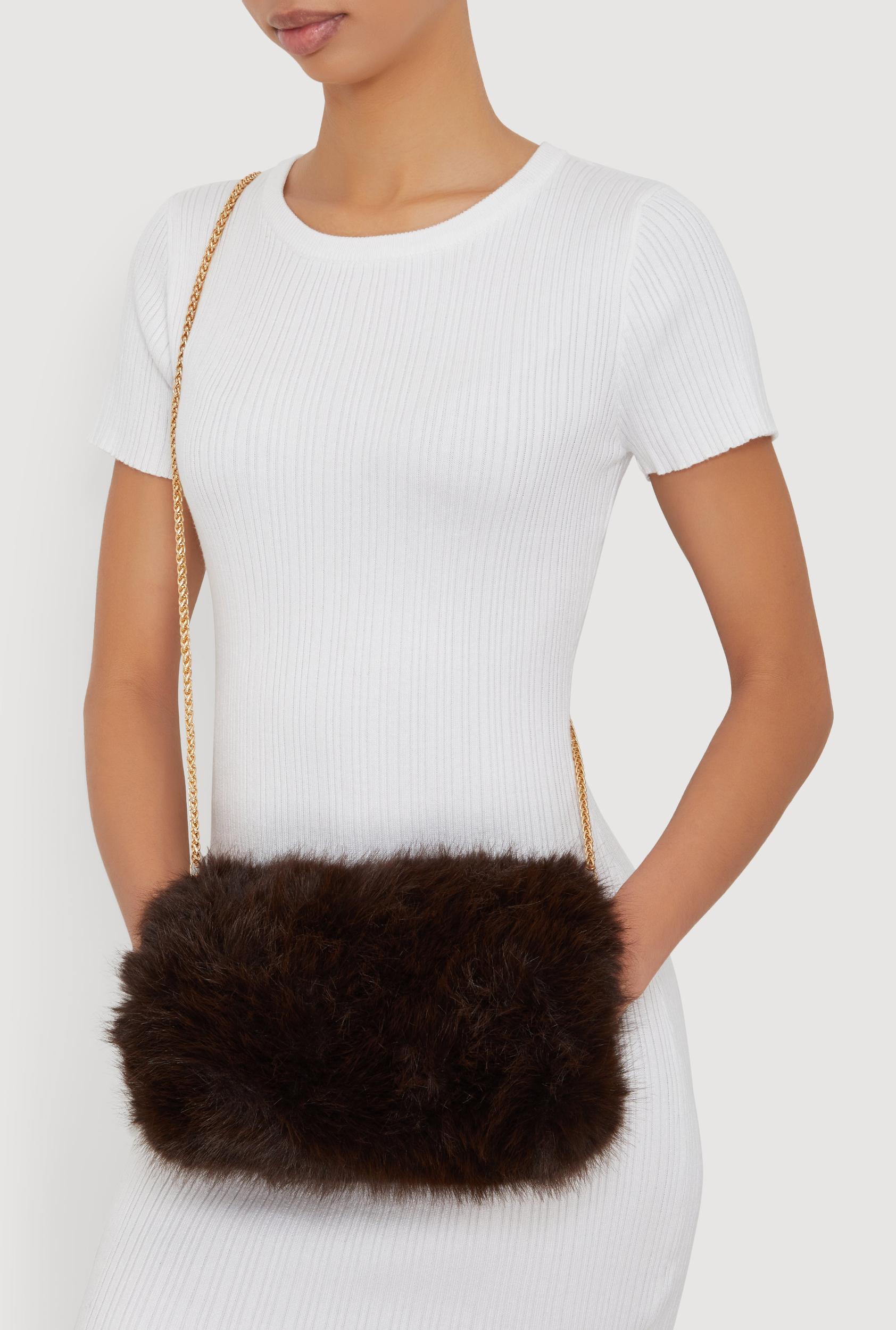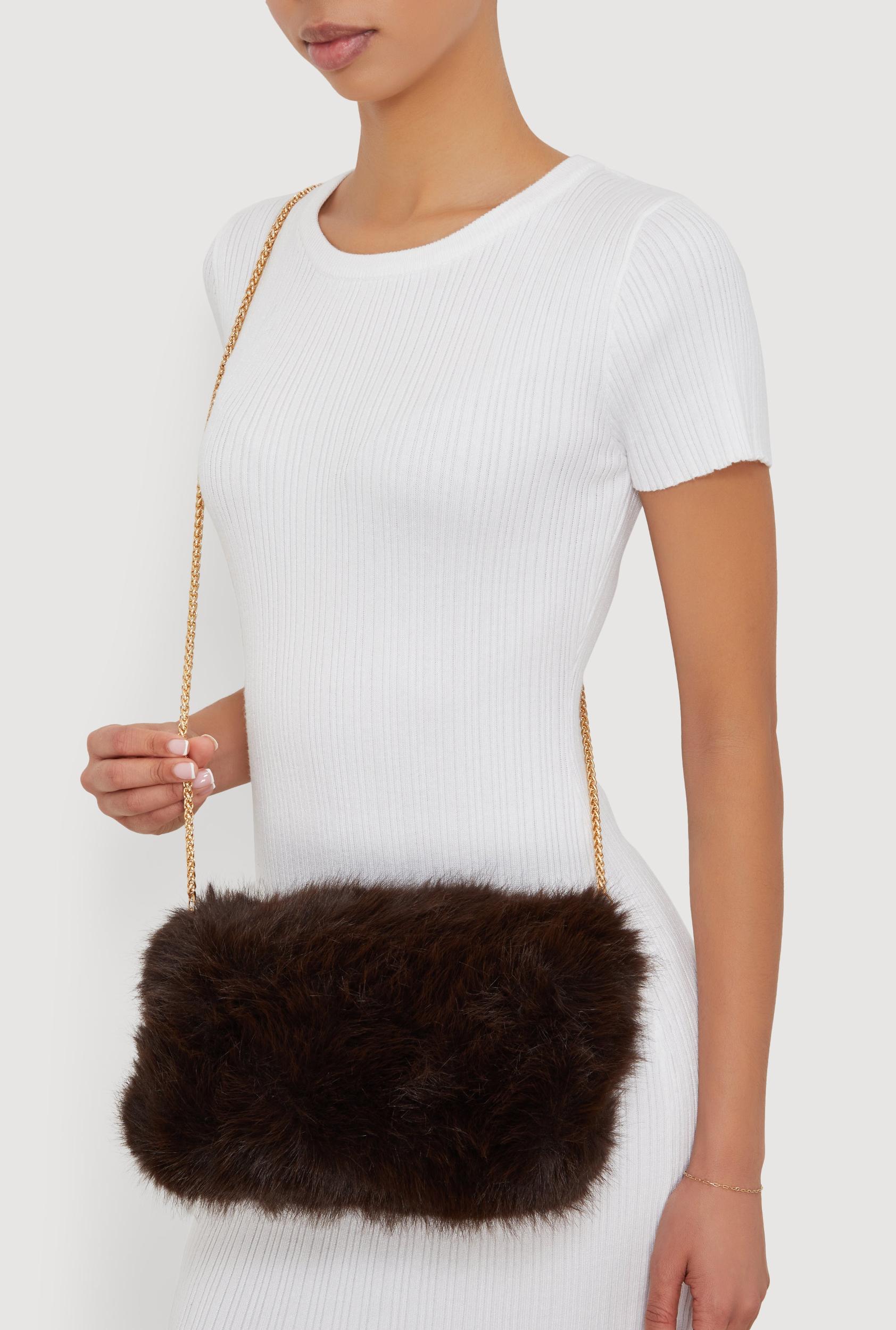 Details and Fit Chains Metallic Solid Removable Chain Strap Length - 48 in. Faux Fur Measurements Bag Height: 6 in Bag Length: 10 in Bag Width: 6 in Content and Care Material: 100% Polyester Faux Fur Country Of Origin: China Rainbow Item Number 1124067448250