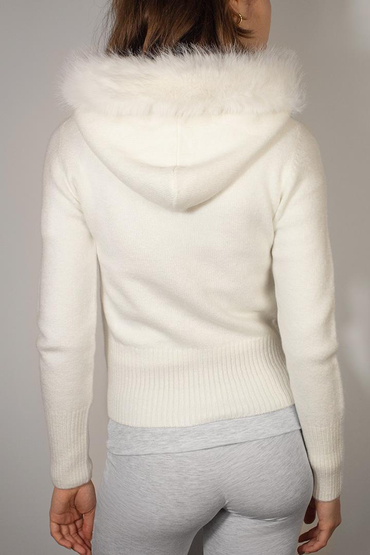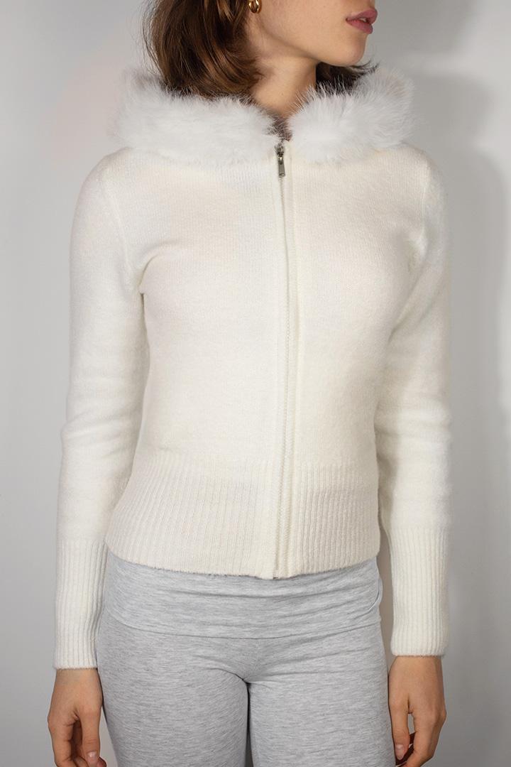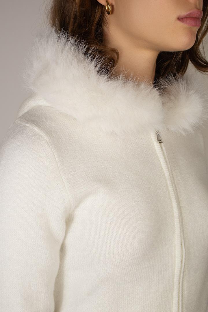 Zip cardigan, with faux fur hood (not of animal origin), long sleeves, regular length, slim fit.