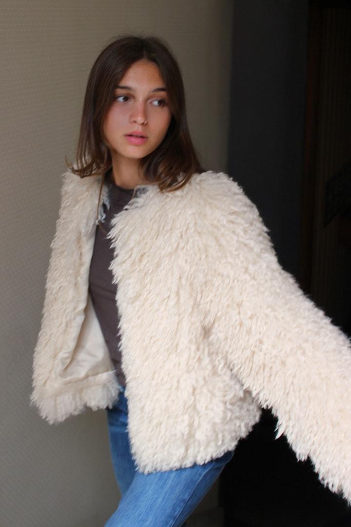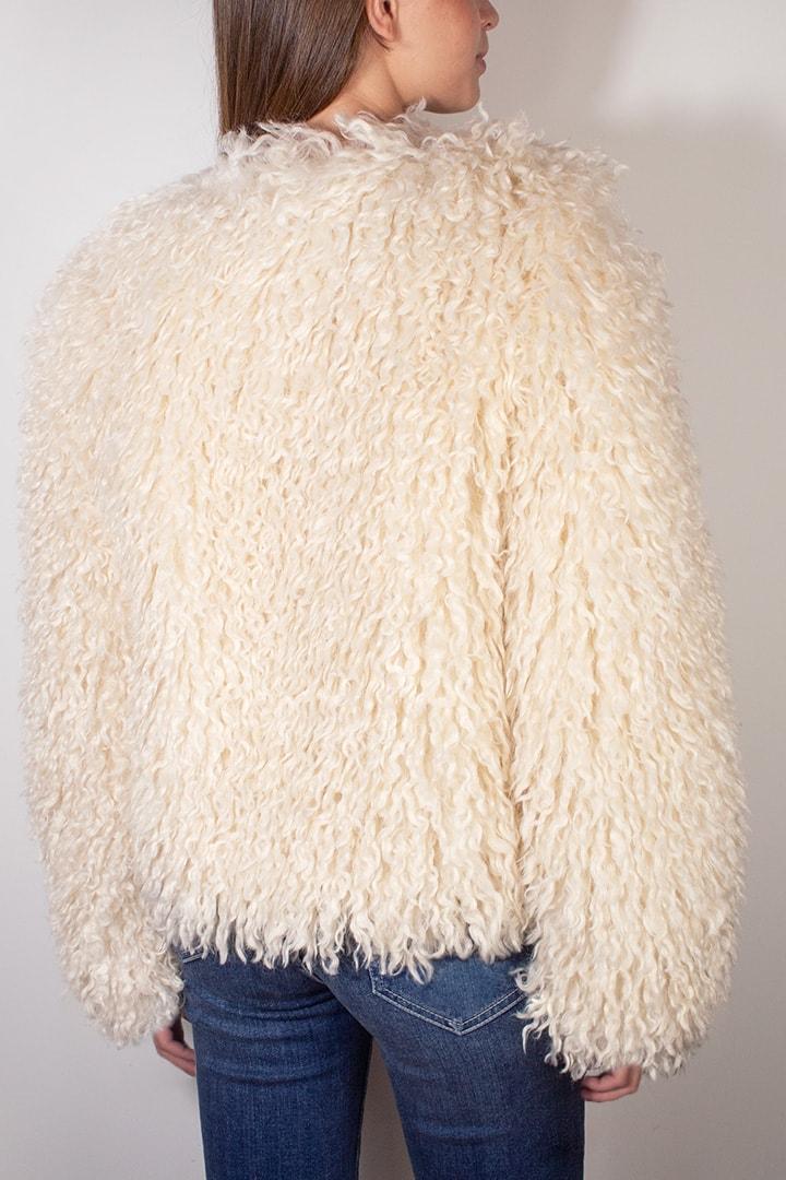 Faux fur jacket (made without animal-derived materials), crew neck, hook-and-eye closure, long sleeves, regular length, relaxed fit.