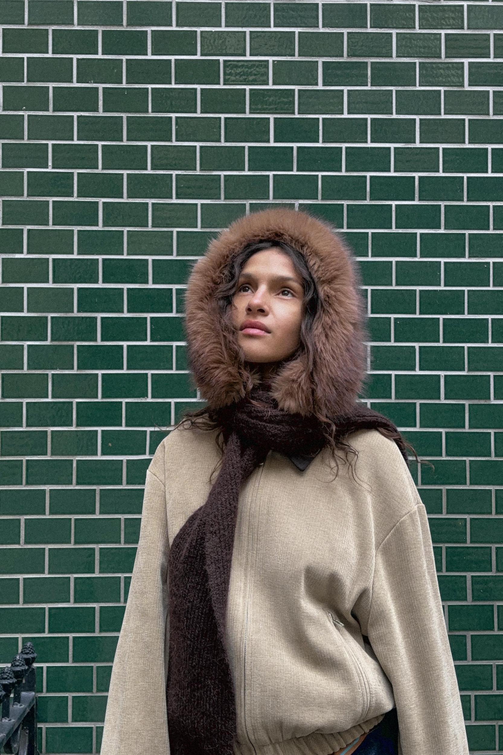 Knit scarf-style hood. Contrasting faux fur trim detail.