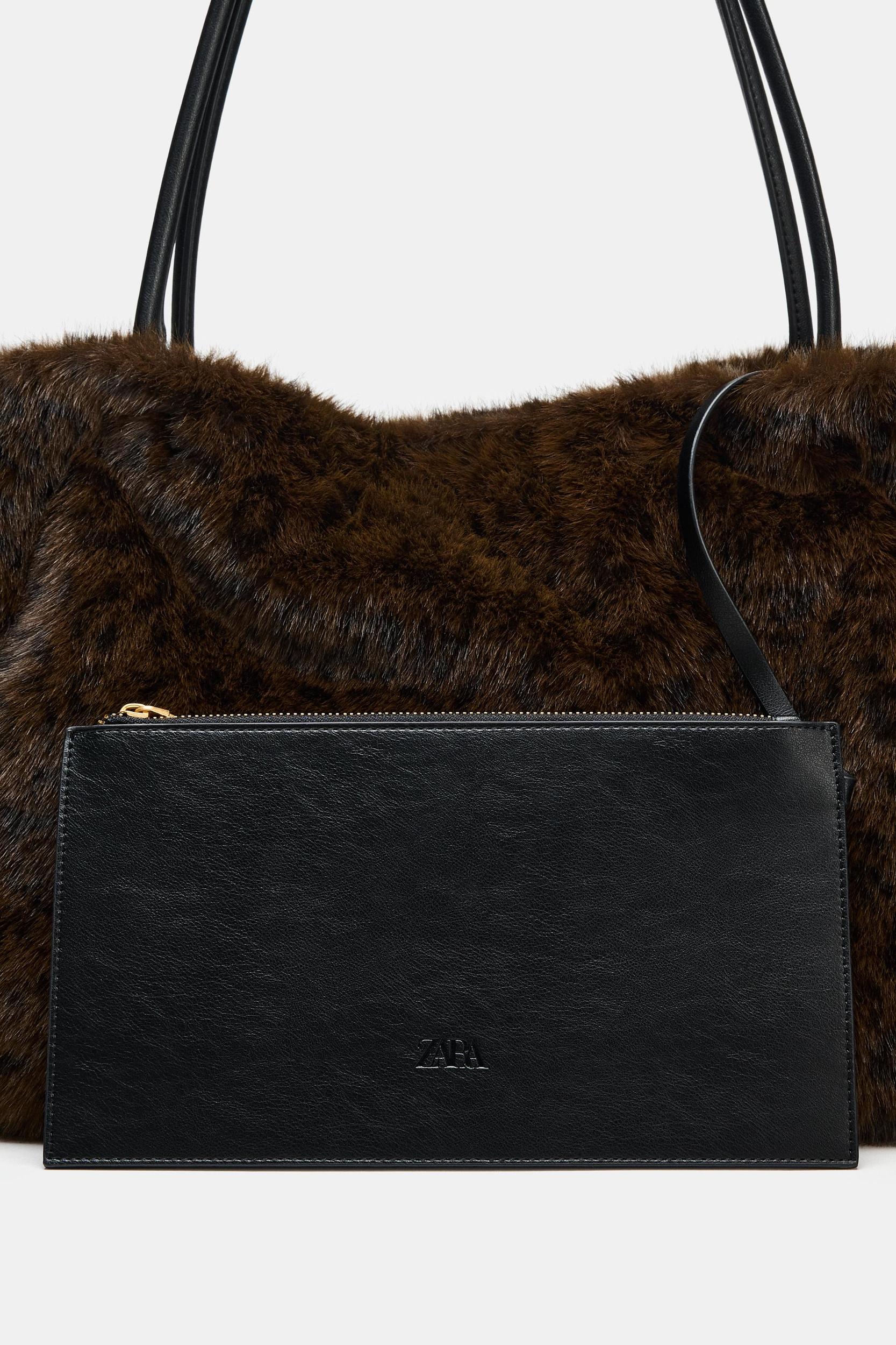 Faux fur shopper bag with animal print. Shoulder strap. Removable interior zip pocket. Magnetic closure. Height x Length x Width: 12 x 15 x 6.7 inches (30.5 x 38 x 17 cm)