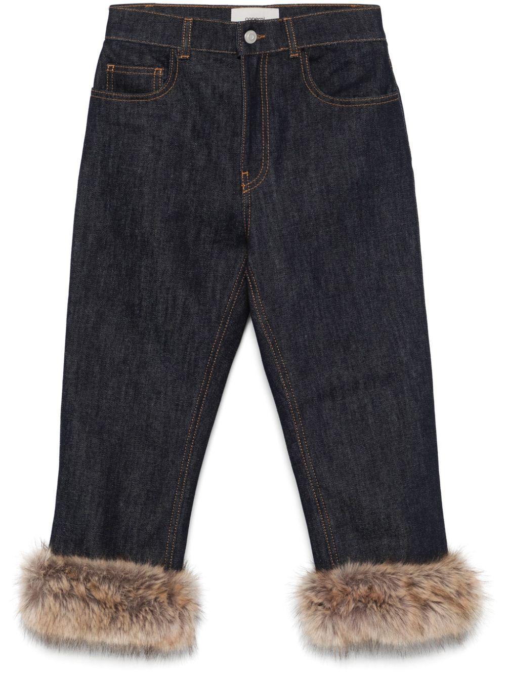 Coperni faux-fur trim jeans | Blue | indigo blue | front button and zip fastening | classic five pockets | belt loops | cropped | Polyester/Cotton | Cropped Jeans | Denim | Clothing | Women