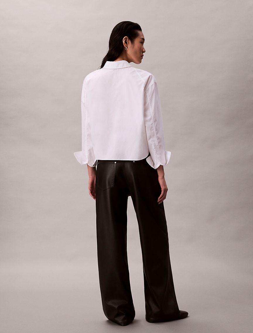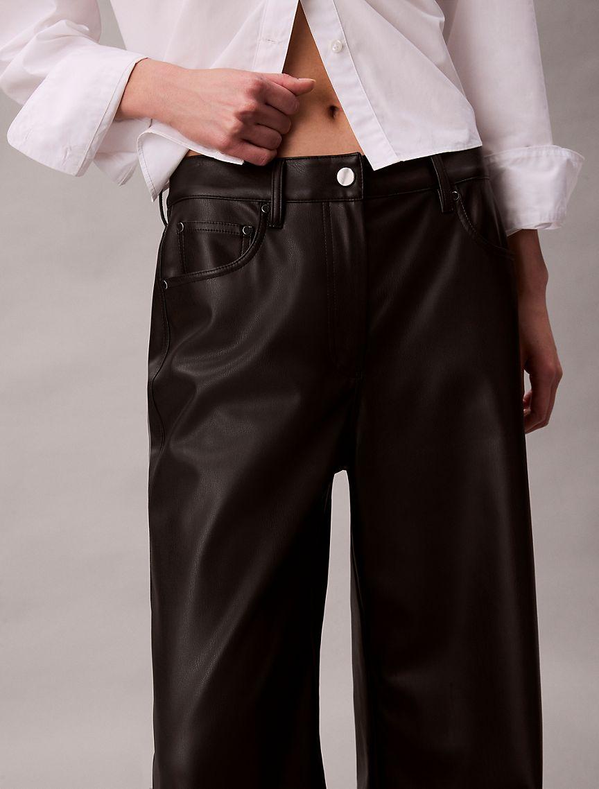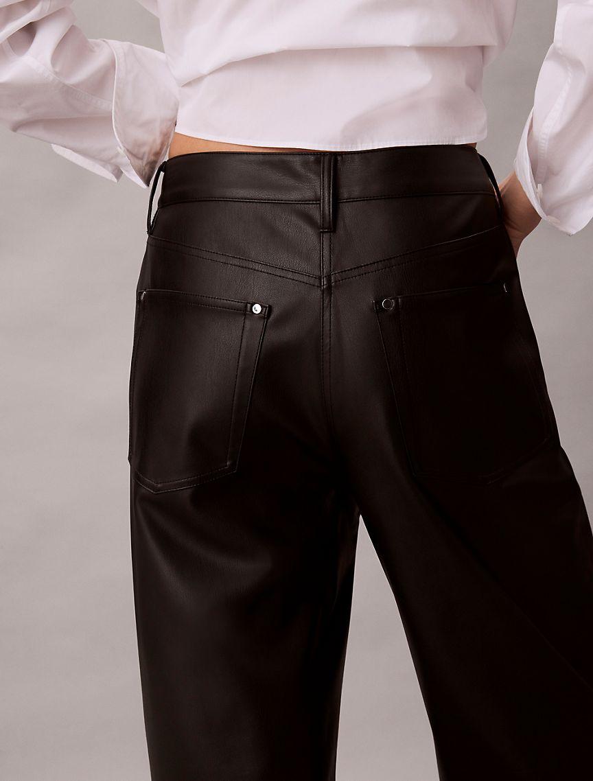 Calvin Klein for women. Refined classics for a curated wardrobe. Minimalist essentials in signature silhouettes. Smooth faux leather in a relaxed straight fit. These pants have a zip fly that secures with a button closure. Cut in a mid rise silhouette.