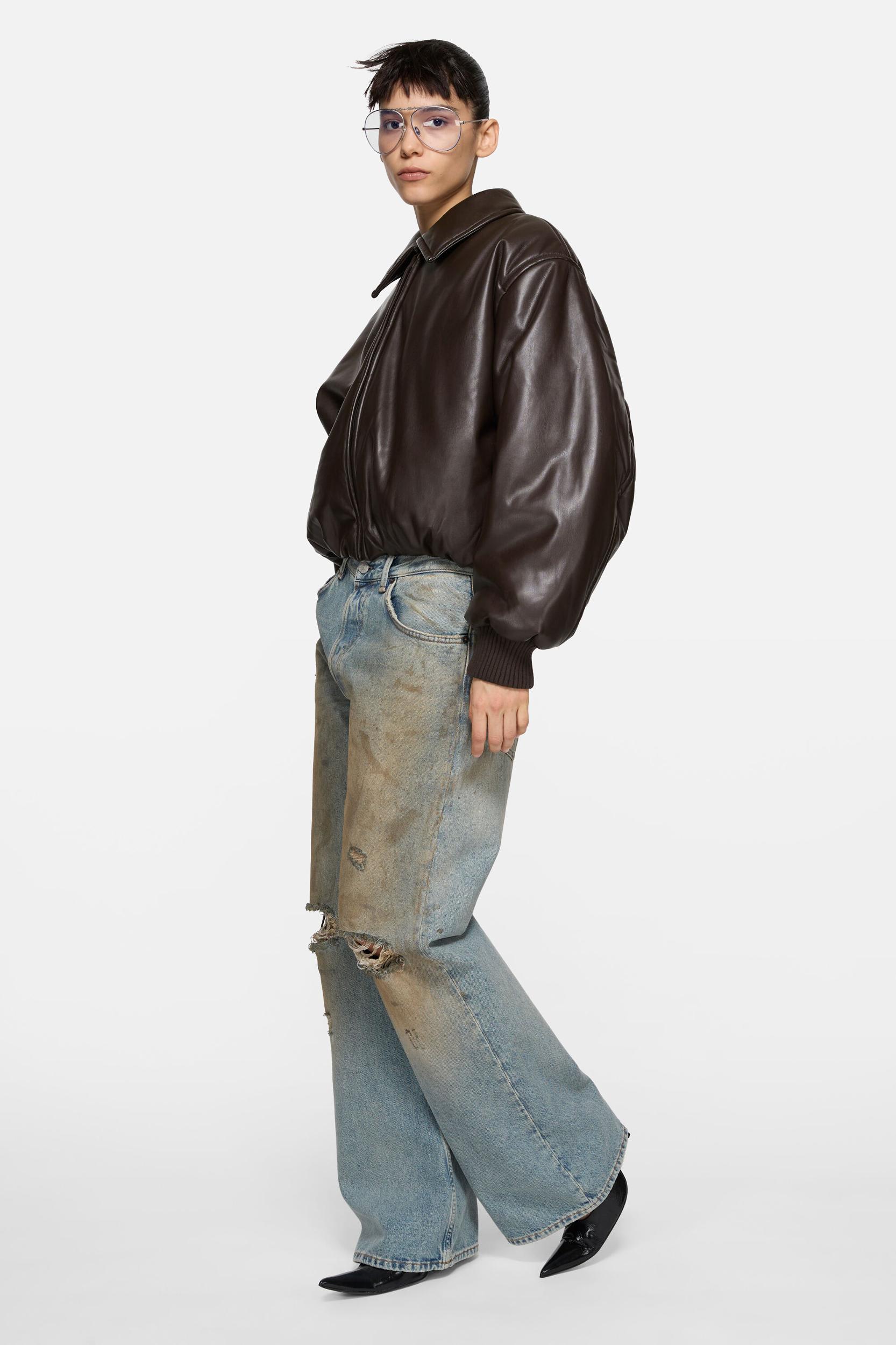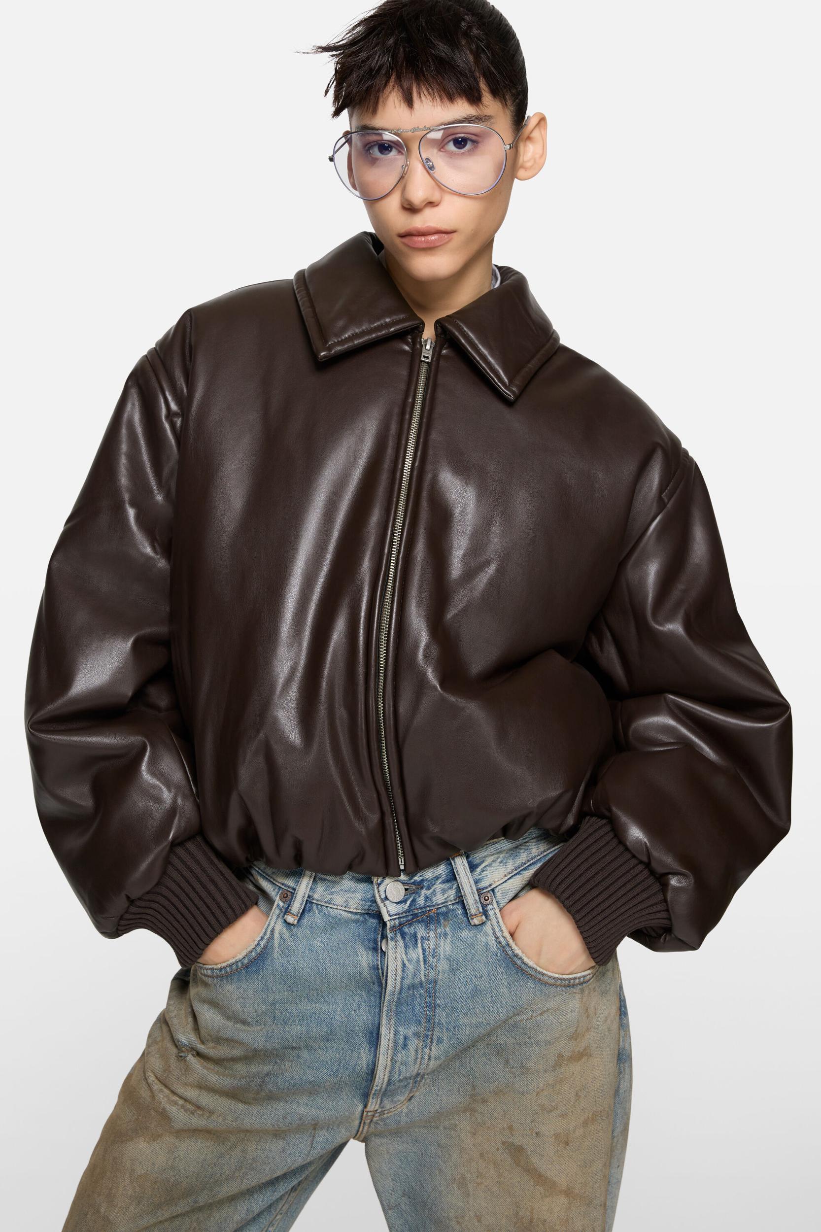 Bomber jacket crafted from faux leather with a grained finish. Features a classic collar, ribbed cuffs, side seam pockets, and an elasticated hem for a gathered silhouette. Finished with a metal logo plaque at the back neckline. Cut to a regular fit. FN-WN-OUTW001084