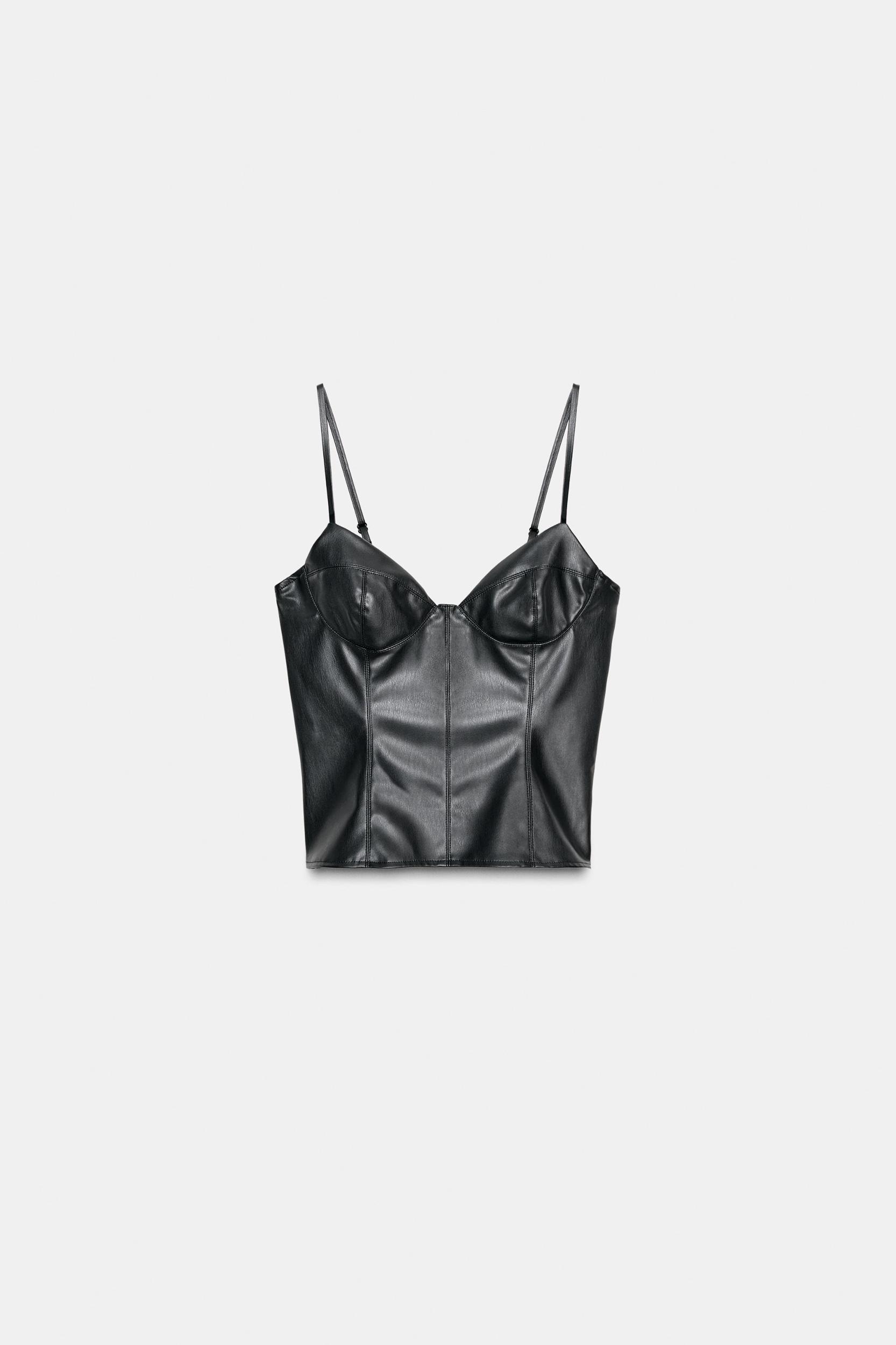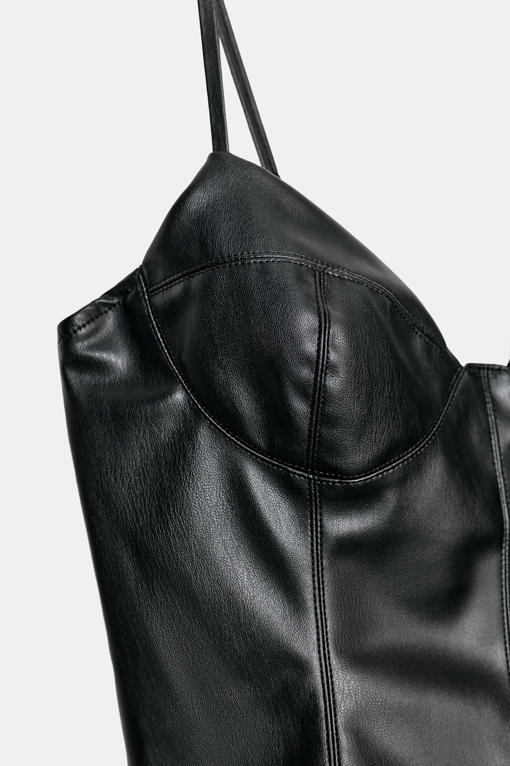 Corset-style top made of faux leather fabric. Sweetheart neckline and adjustable spaghetti straps. Hidden in-seam zip closure.
