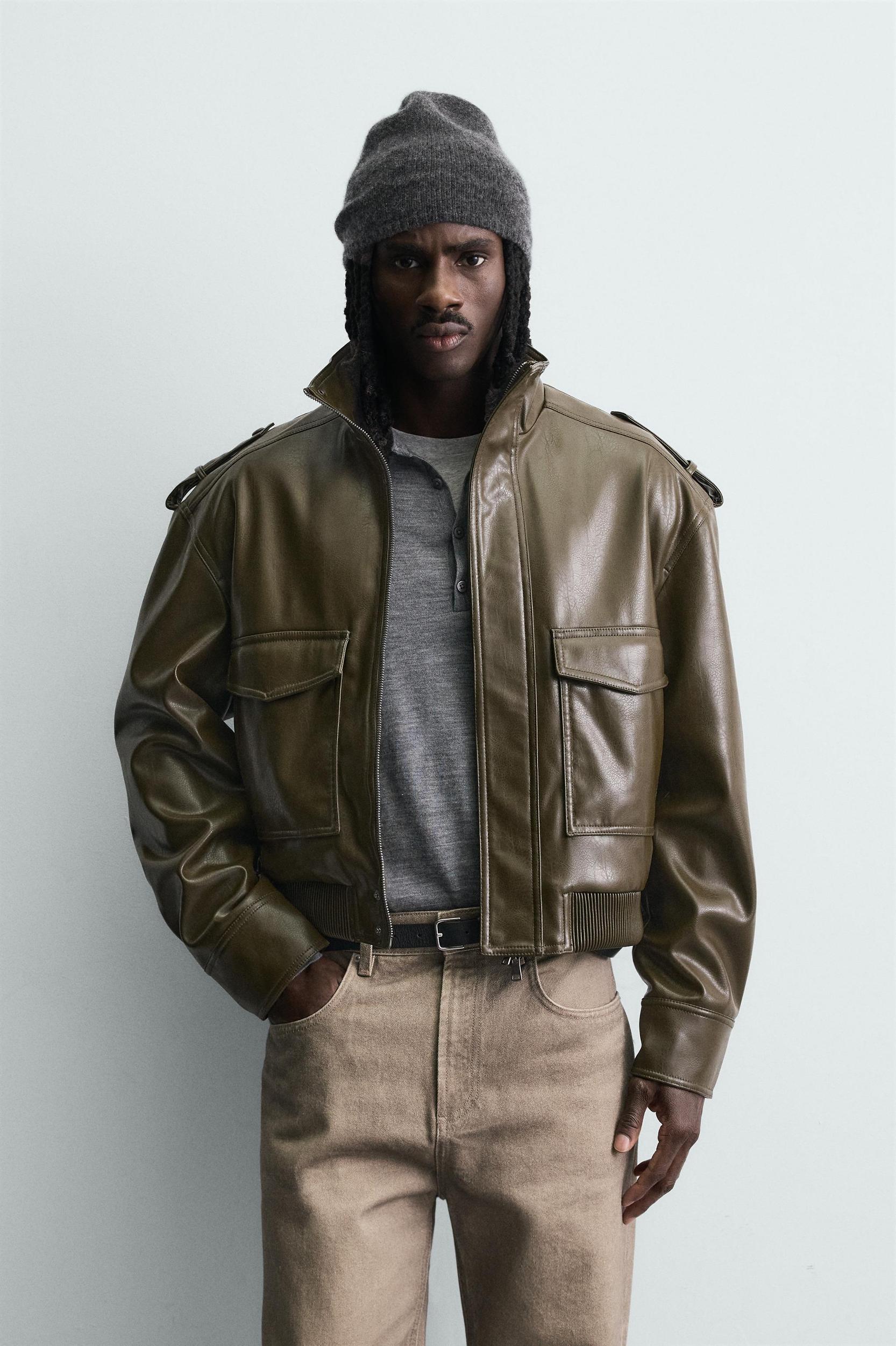 Cropped fit jacket made of faux leather fabric. High collar and long sleeves with buttoned cuffs. Shoulder tab details. Flap patch pockets at chest and welt pockets at hip. Interior pocket detail. Elastic hem. Front hidden zip closure with snap button placket.