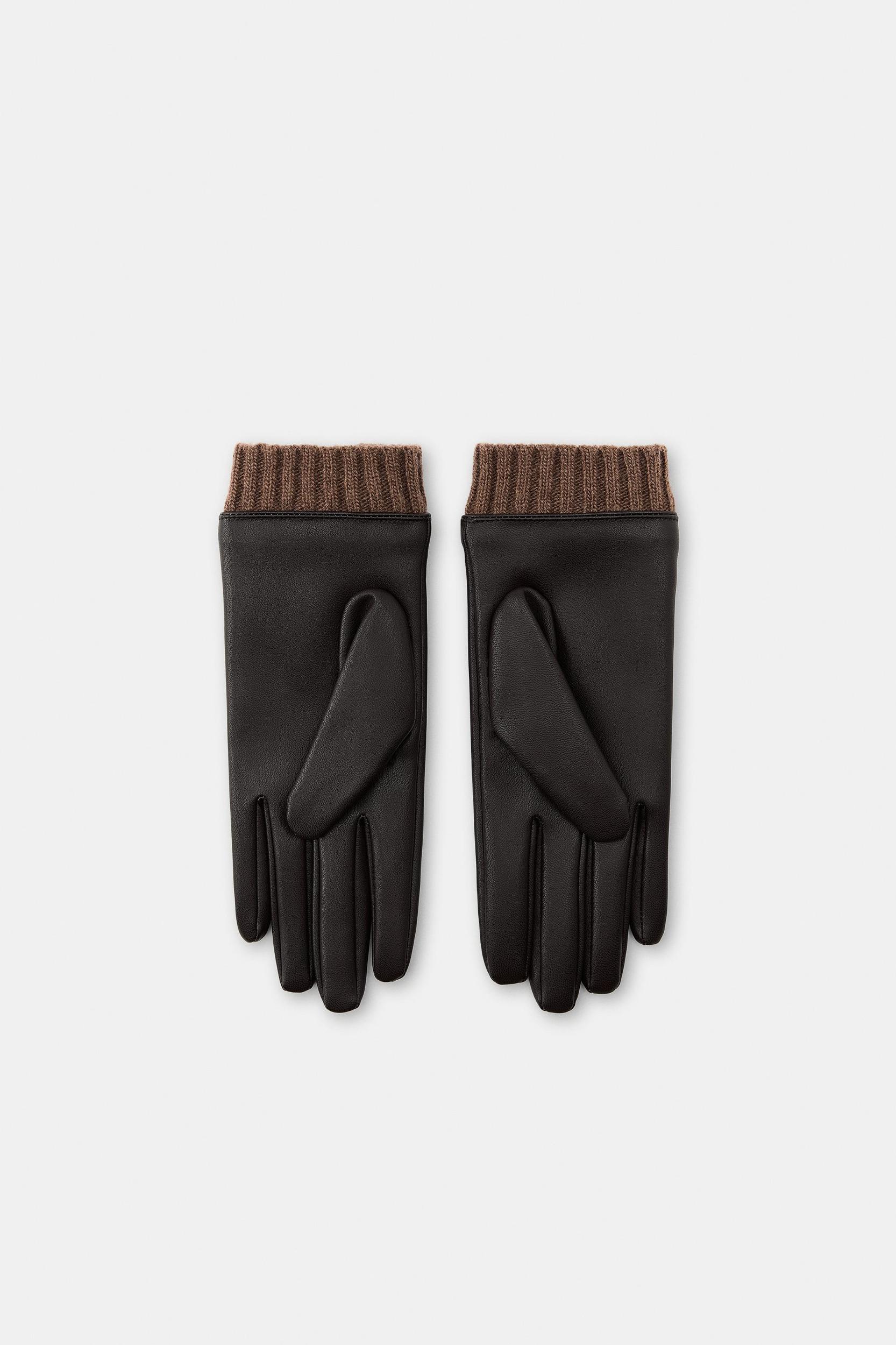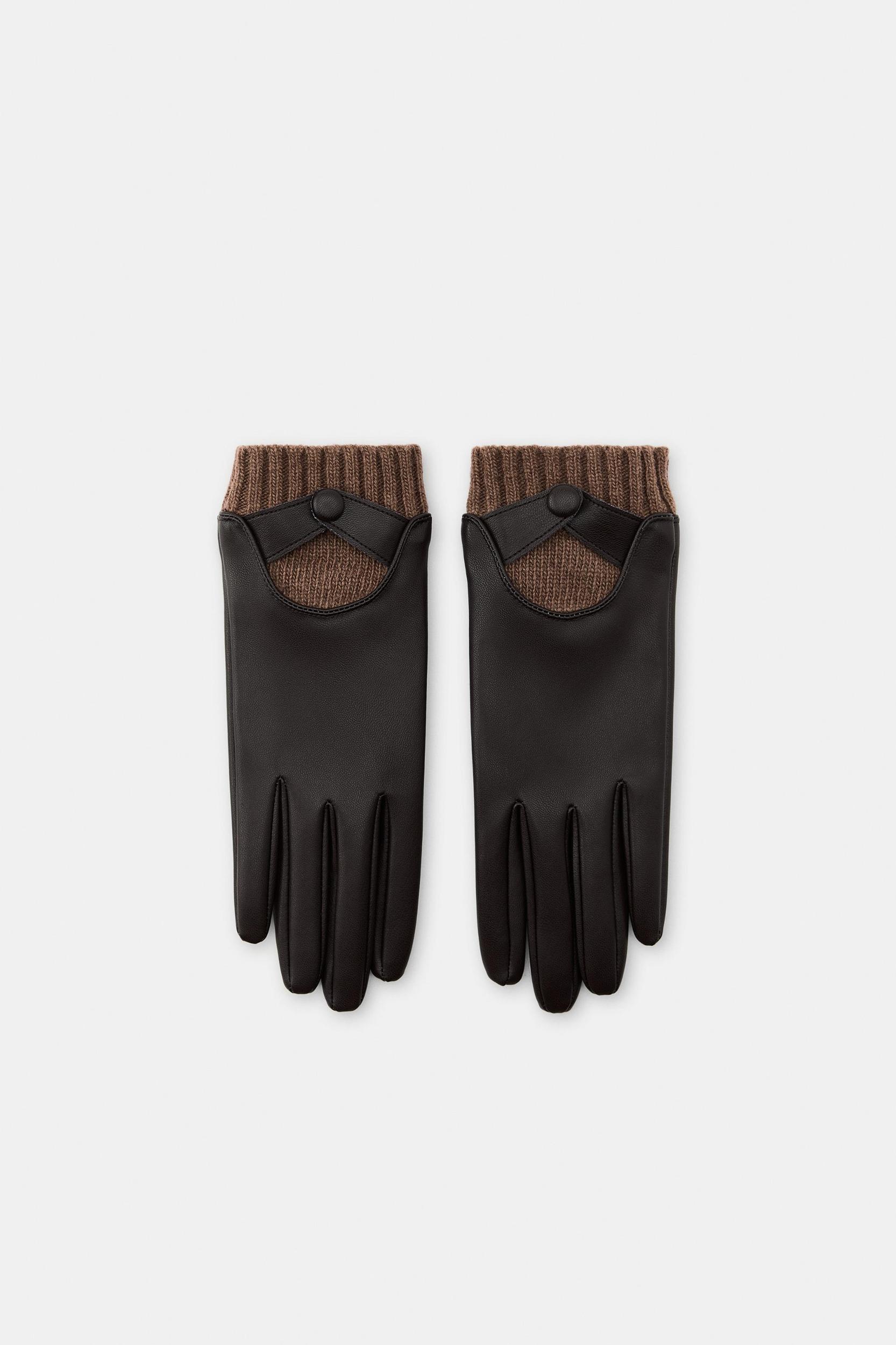 Short faux leather combination gloves. Fabric application made of yarn with contrasting wool. Snap-button fastening.