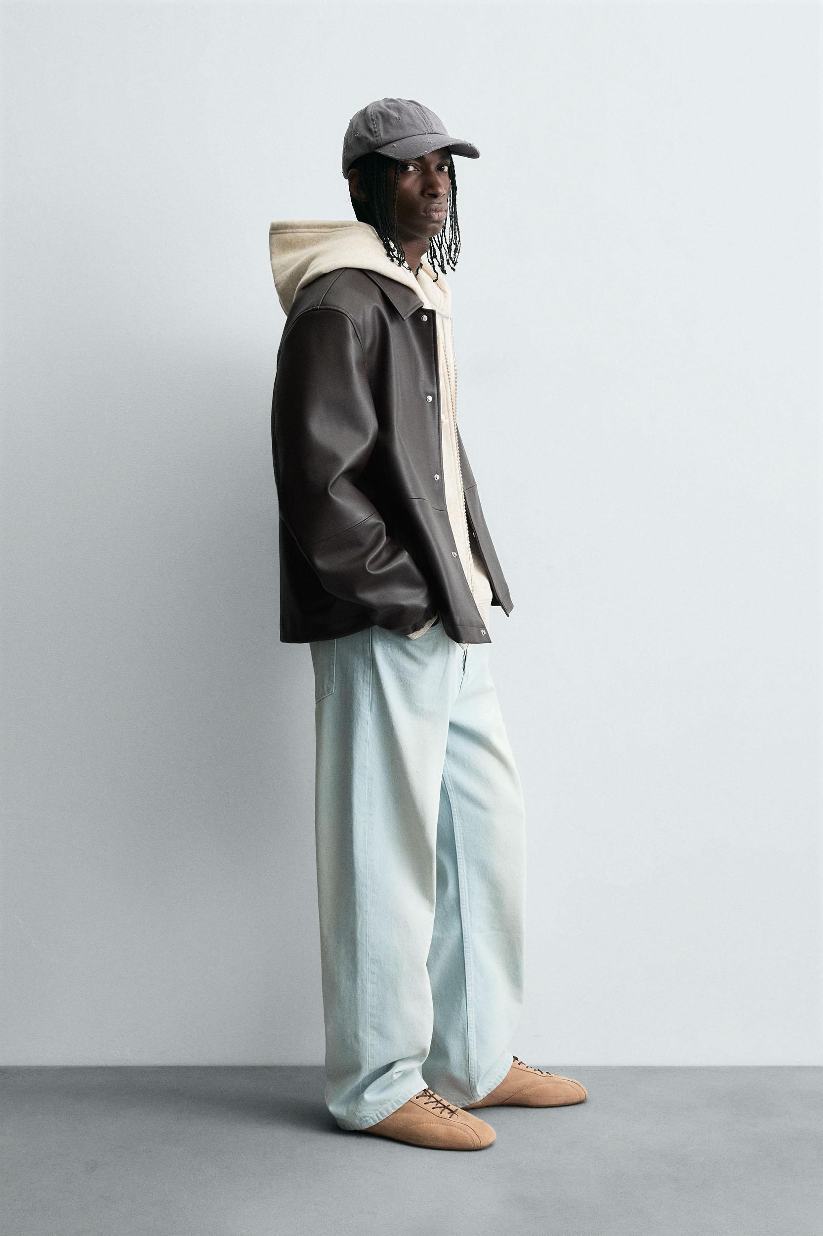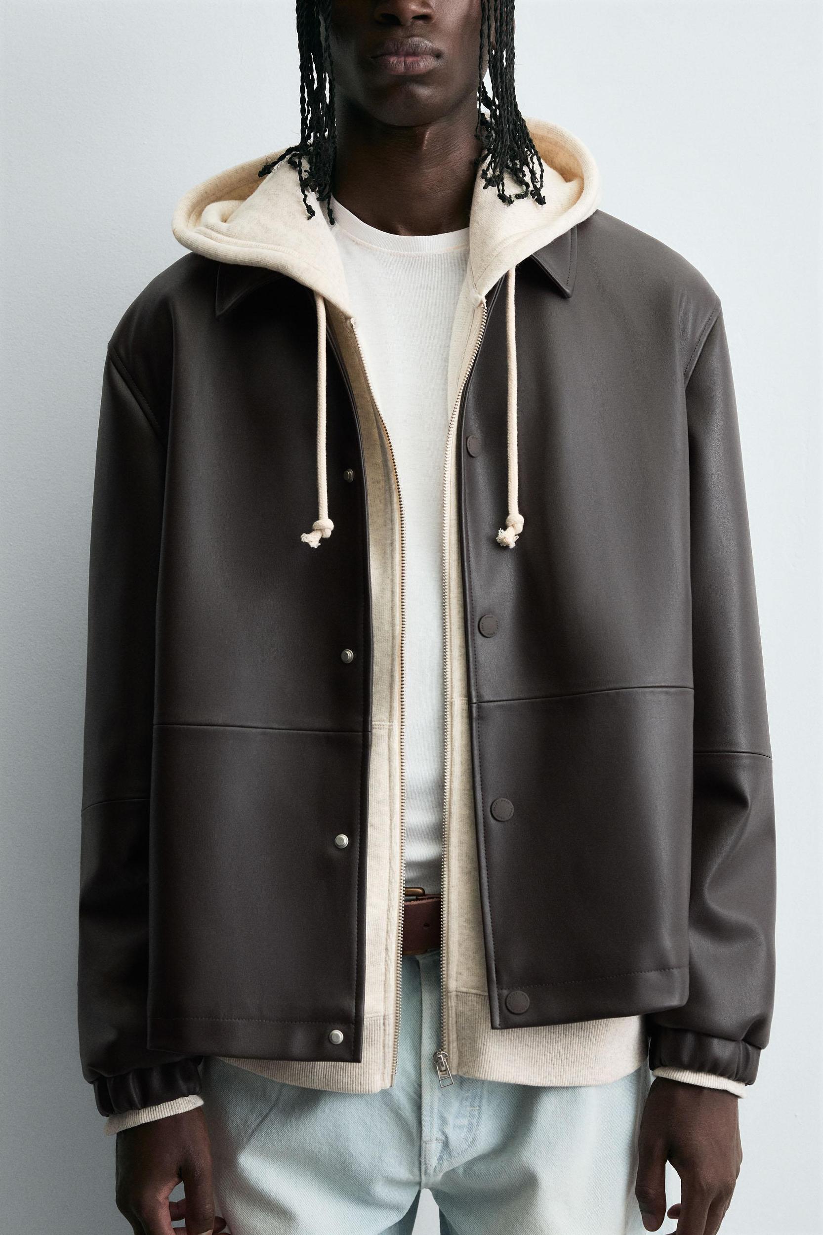 Relaxed fit jacket made in faux leather fabric. Lapel collar and long sleeves with elastic cuffs. Welt pockets at hip and interior pocket detail. Front snap button closure.