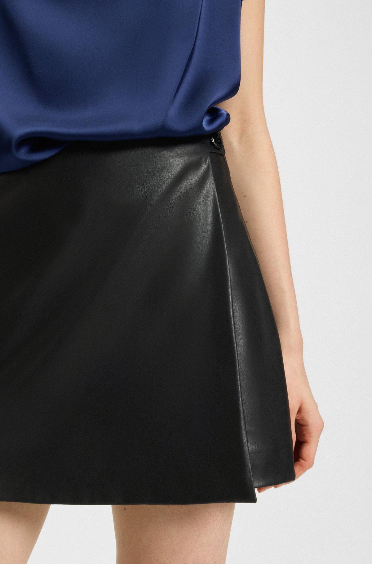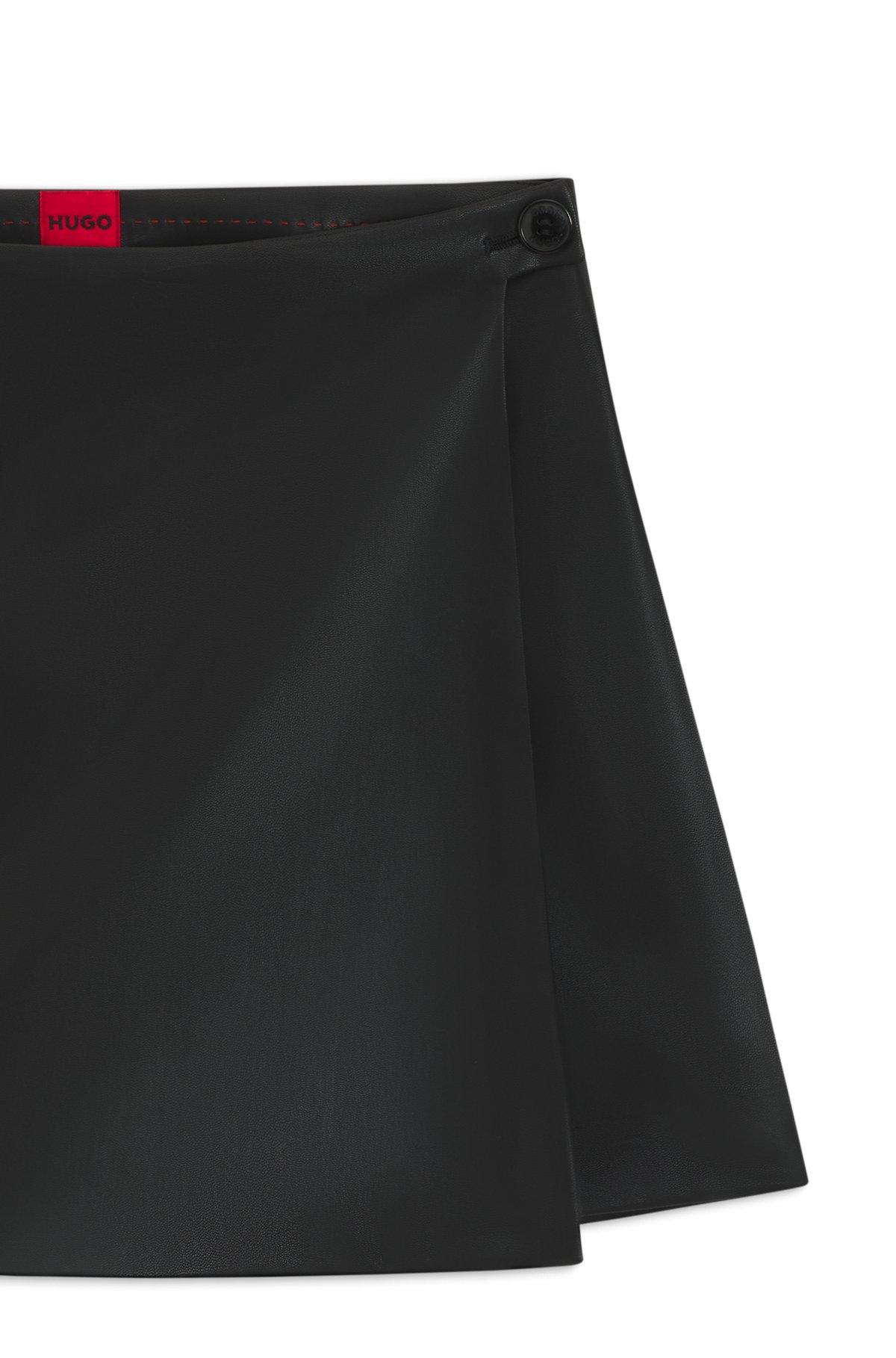 With a wrap front and button detail, this HUGO Womenswear mini skort is a modern take on a classic. Crafted in soft synthetic coated fabric. Synthetic coated fabric, sometimes referred to as faux leather, is a fabric designed to resemble real leather, and/or display a matte, glossy, smooth, or textured, coated appearance.