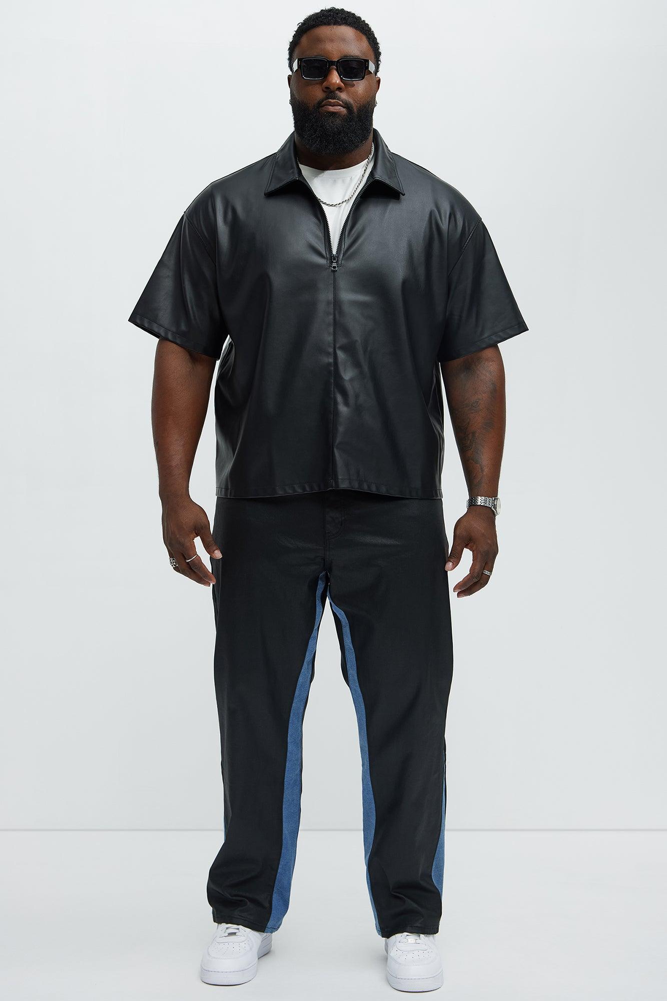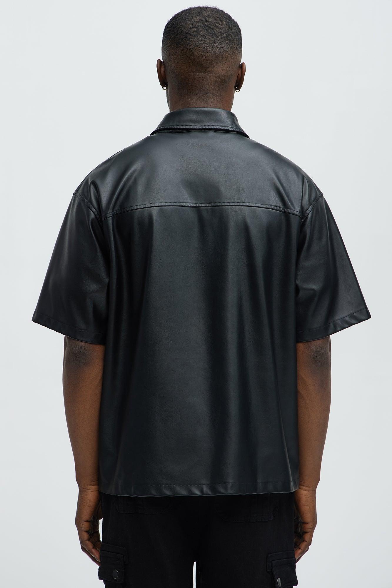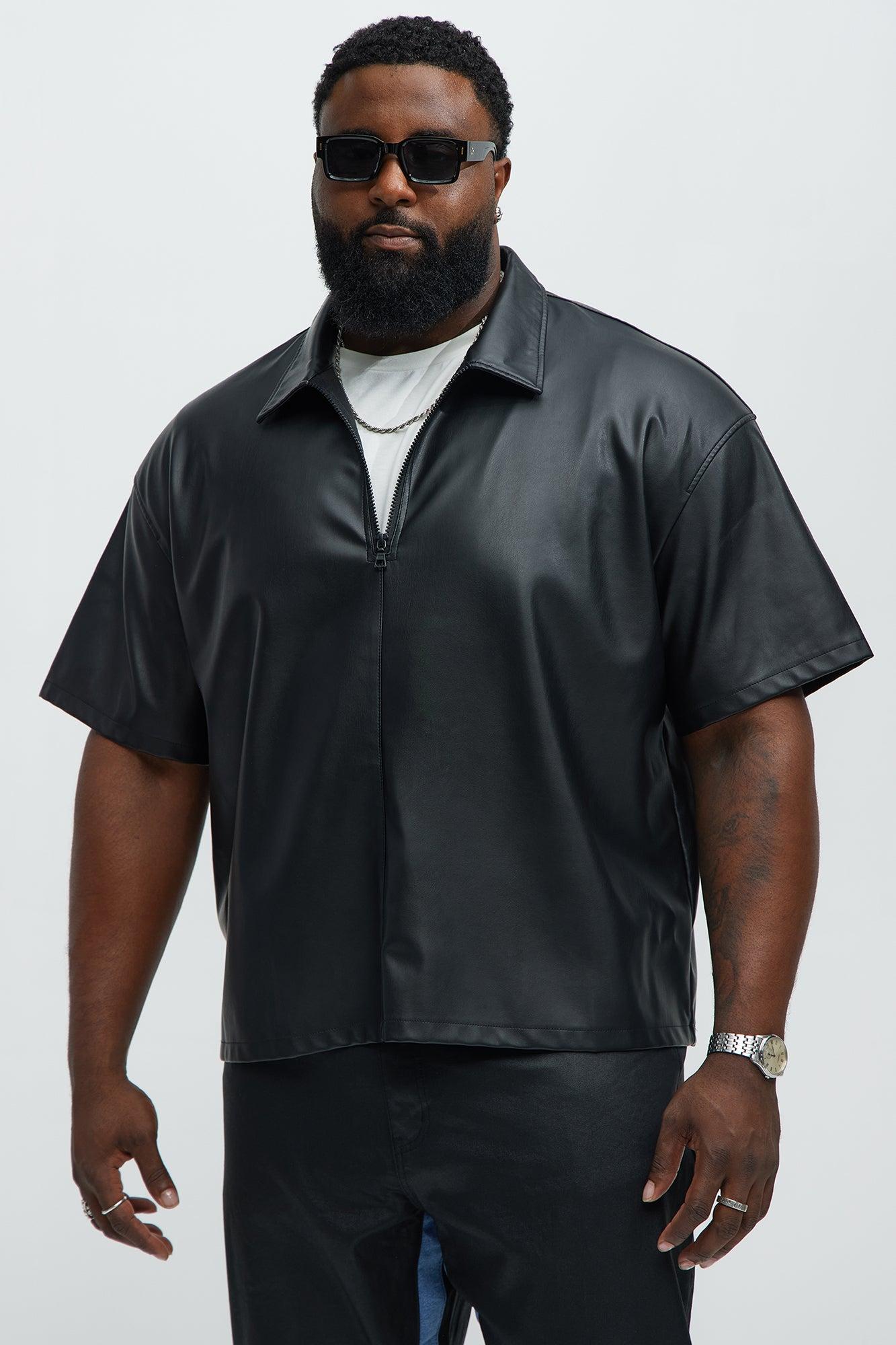 Faux Leather Quarter Zip Short Sleeve Tee - Black