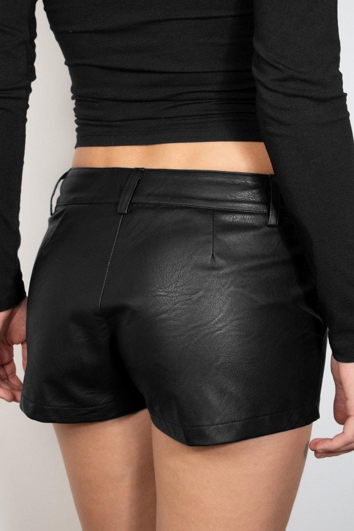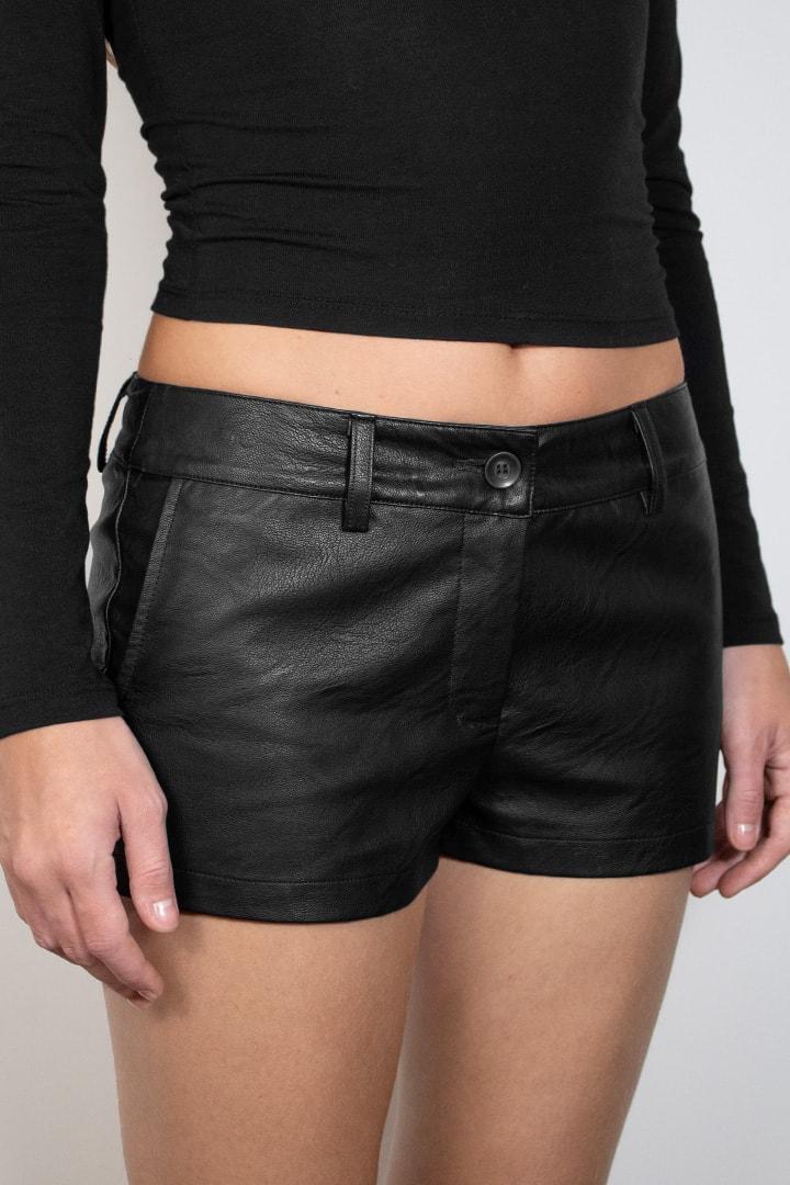 Faux leather shorts (PU), very low waist, zip and button closure, belt loops, short length, slim fit.