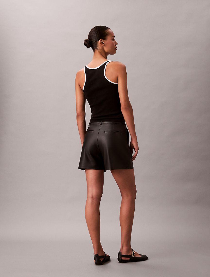 Sleek faux leather shorts with tailored pleats at the front. These shorts are high-waisted with a zip fly and top button closure. Detailed with angled pockets at the sides.